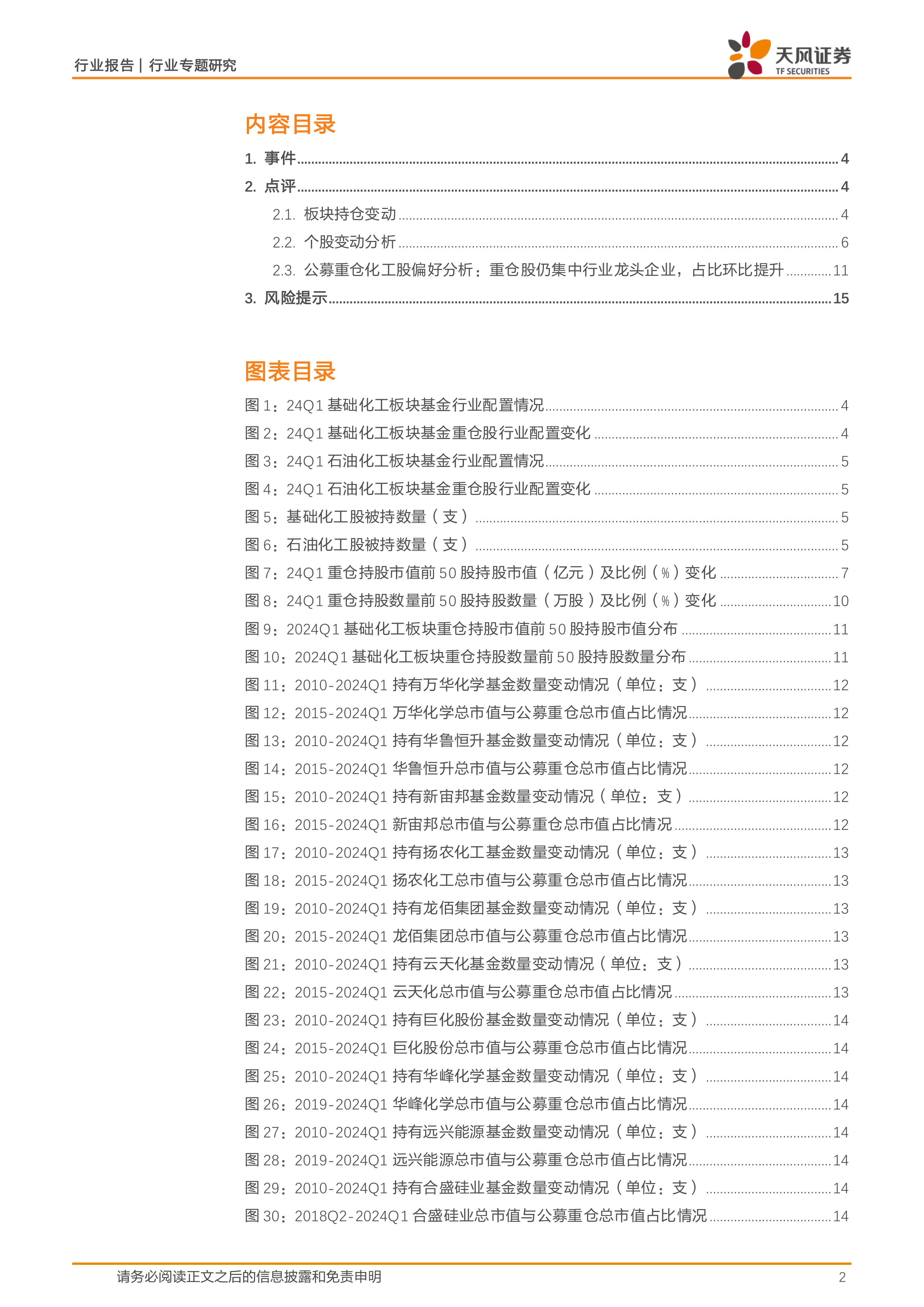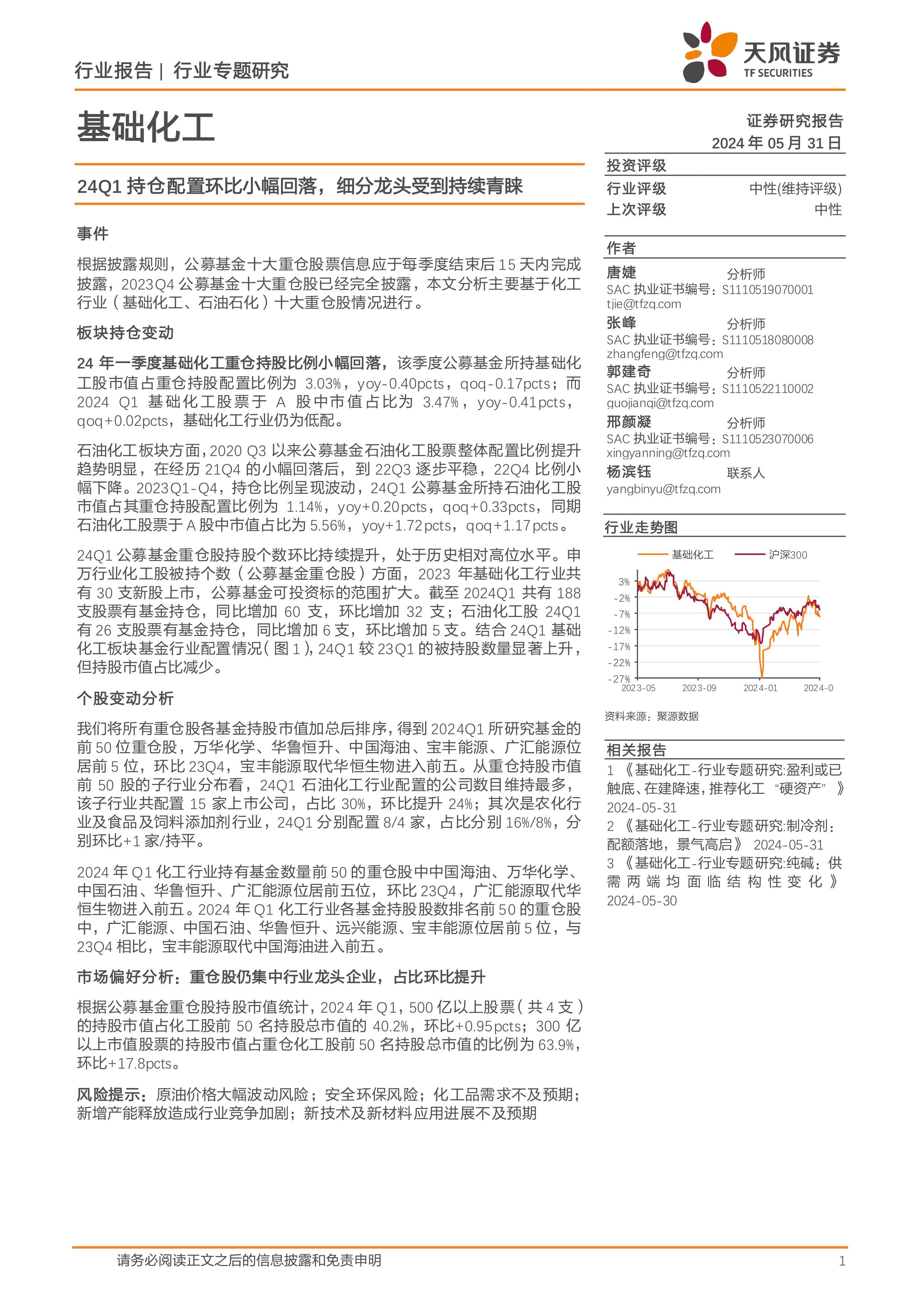 本报告基于2023年Q4和2024年Q1公募基金十大重仓股数据,对基础化工和石油化工行业进行市场分析。核心观点如下: