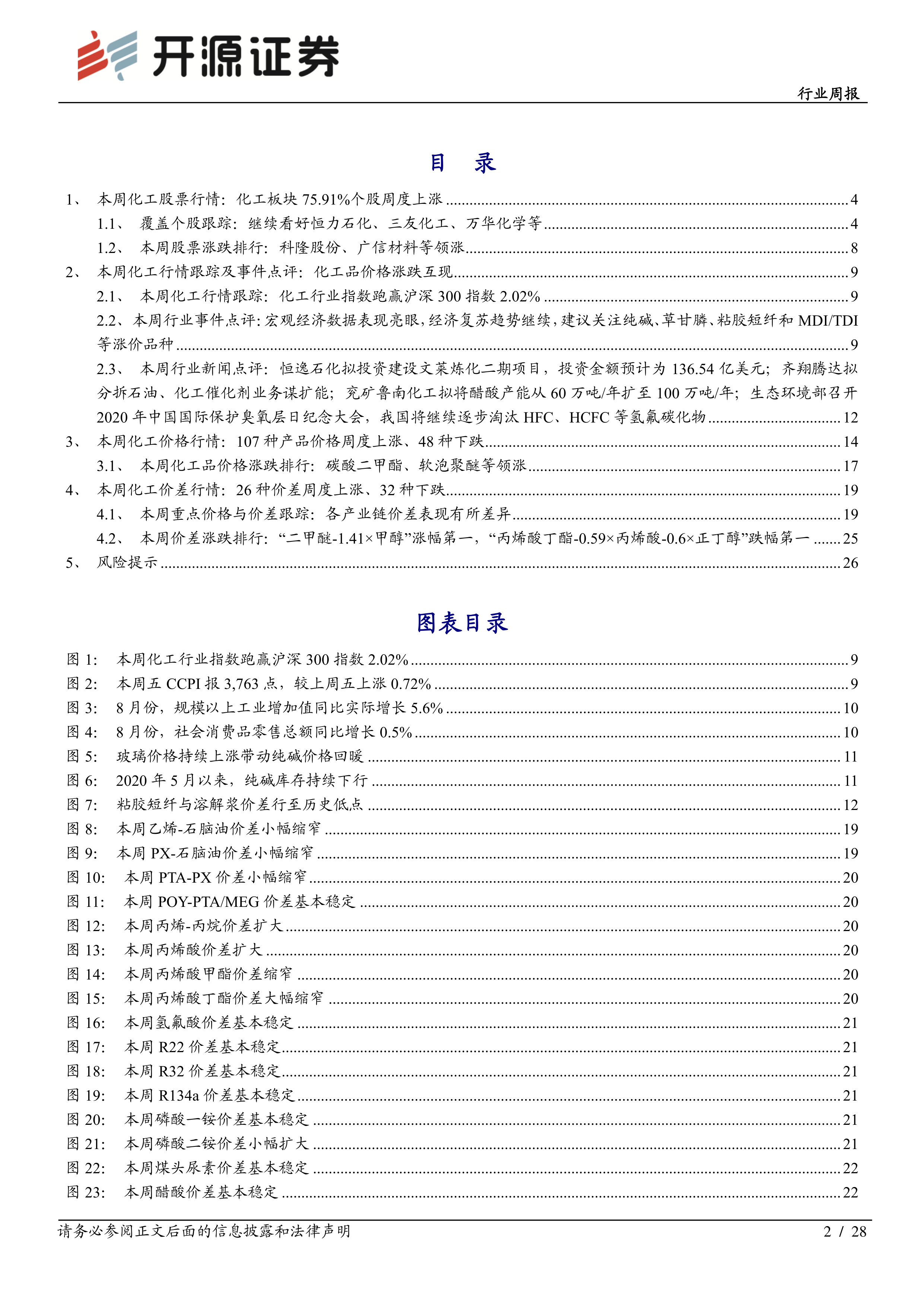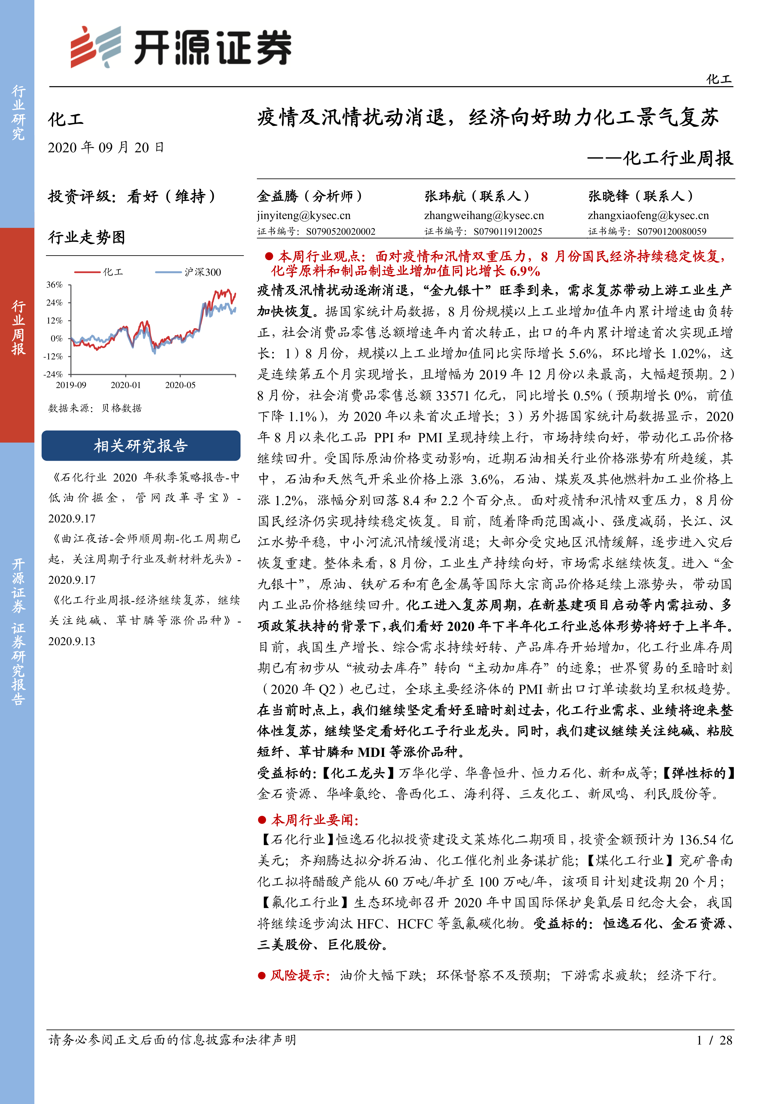 本报告基于国家统计局数据、Wind数据、百川盈孚数据以及公司公告等信息,对2020年9月14日至18日一周的中国化工行业市场行情进行了全面分析。报告认为,宏观经济复苏、疫情和汛情影响消退、“金九银十”旺季到来以及化工行业库存周期变化等因素共同推动了化工行业景气度回升。报告建议投资者关注纯碱、粘胶短纤、草甘膦和MDI等涨价品种,并推荐了部分化工龙头和弹性标的股票。 报告同时提示了油价大幅下跌、环保督察不及预期、下游需求疲软以及经济下行等风险因素。 报告内容翔实,数据可靠,分析客观,为投资者提供了有价值的参考信息。