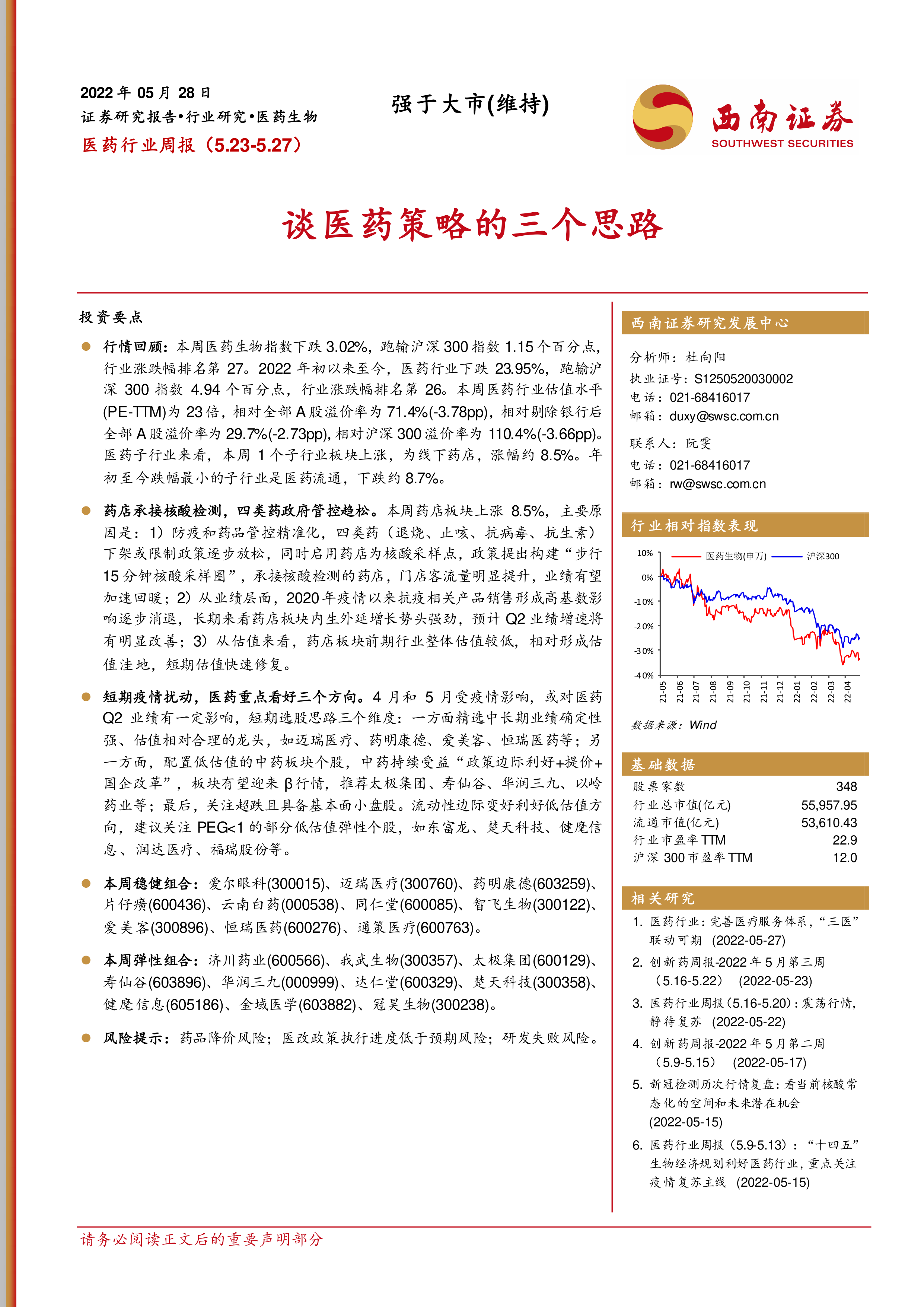 本报告的核心观点是:2022年5月23日至27日,医药生物指数下跌3.02%,跑输沪深300指数1.15个百分点。短期内,疫情扰动对医药行业Q2业绩造成一定影响。然而,药店板块因承接核酸检测和四类药管控趋松而上涨8.5%,展现出一定的韧性。西南证券建议投资者关注三个投资方向:中长期业绩确定性强且估值合理的龙头企业;低估值的中药板块个股;以及超跌且具备基本面的小盘股。