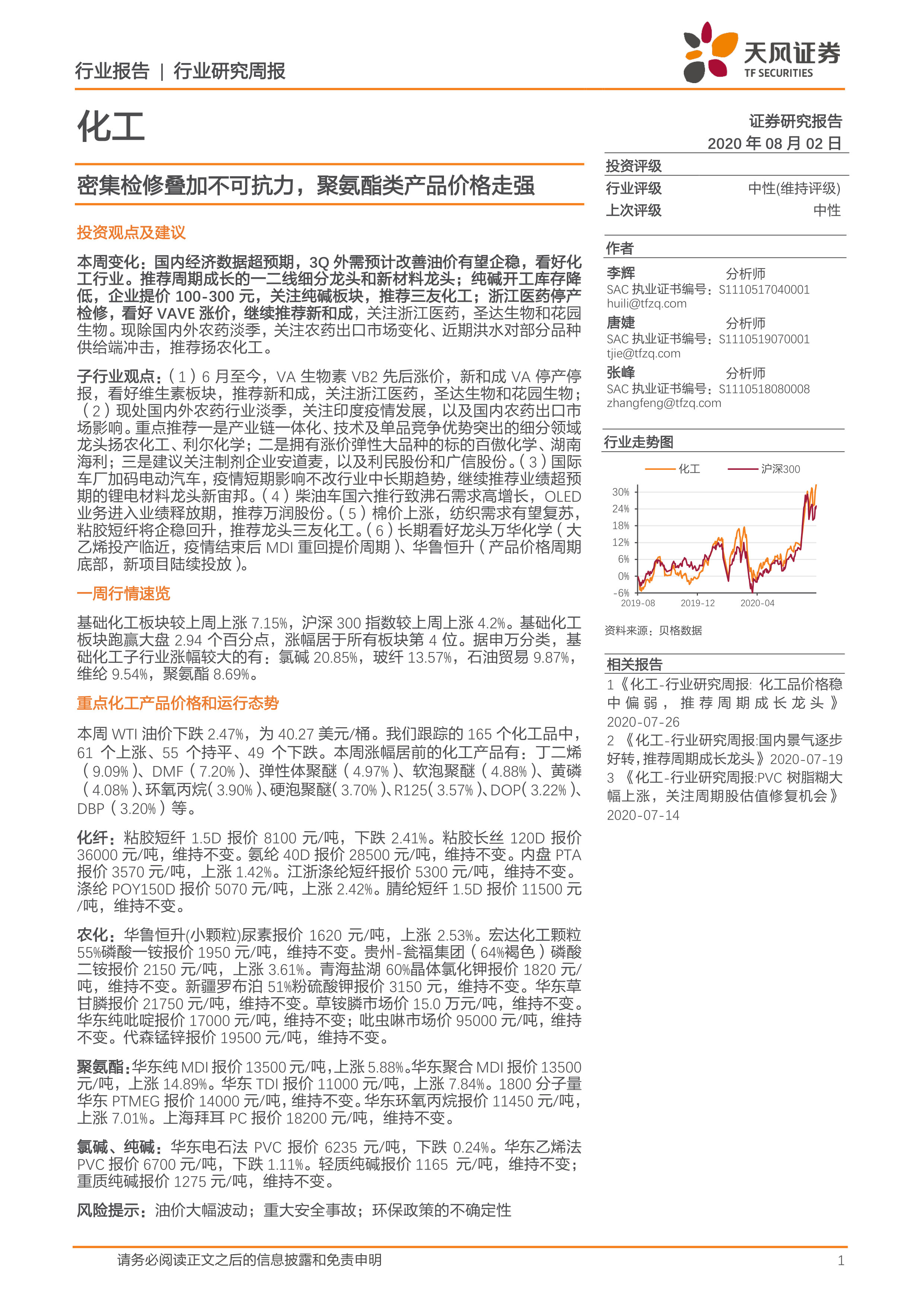 化工行业研究周报:密集检修叠加不可抗力,聚氨酯类产品价格走强