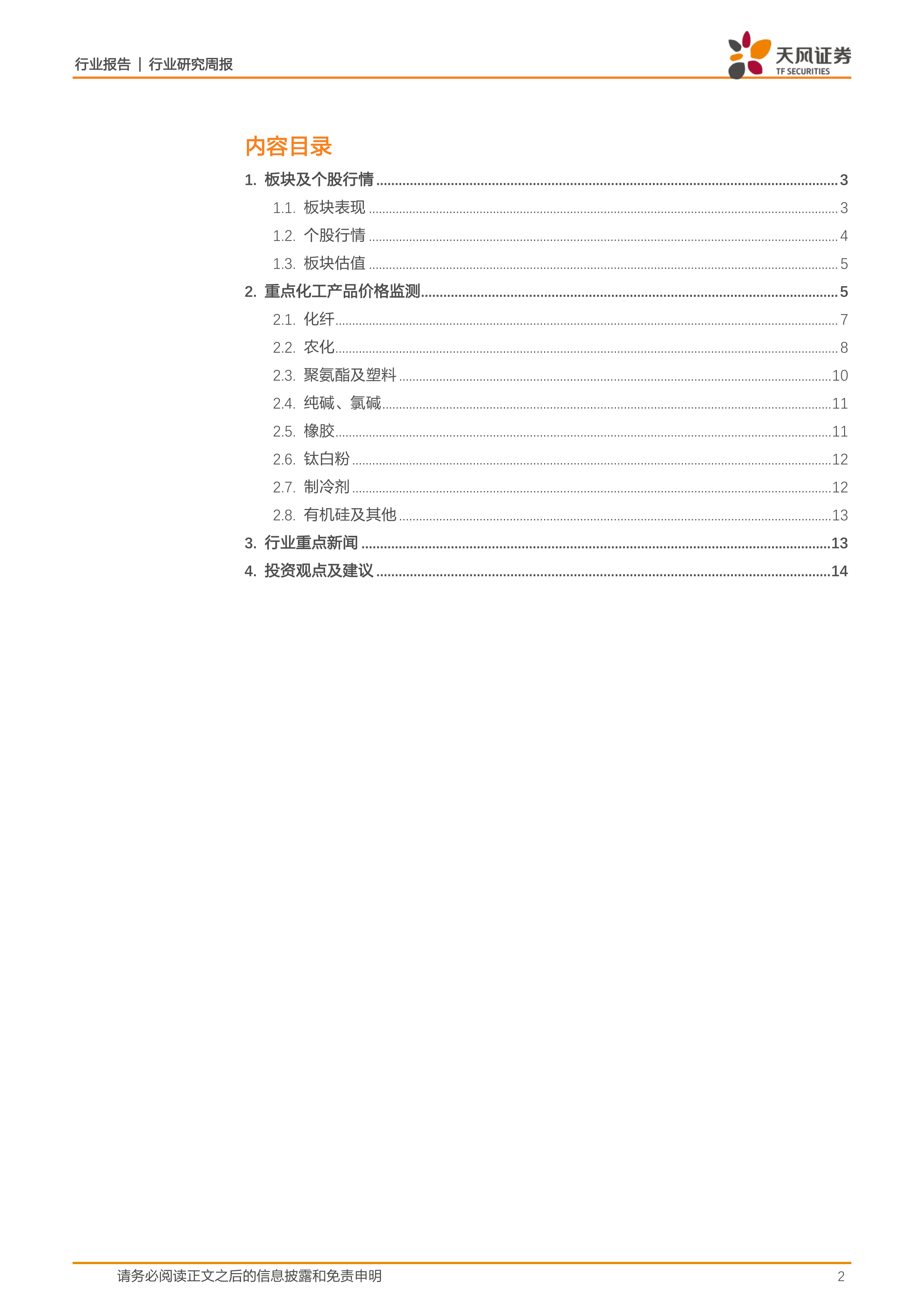 报告基于市场分析和行业展望,给出了具体的投资观点和建议,包括推荐周期成长的一二线细分龙头企业和新材料龙头企业,并对纯碱、维生素、农药等细分领域的投资机会进行了分析。 报告还指出了油价大幅波动、重大安全事故和环保政策不确定性等潜在风险。