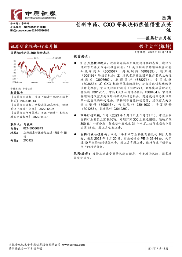 本报告基于对2023年1月医药市场表现、行业估值、原料药及中药材价格走势的分析,以及对近期行业政策和市场动态的解读,认为在新冠疫情趋于稳定后,创新中药、国产医疗器械和CXO板块仍然值得重点关注,眼科领域也存在较好的投资机会。报告同时提示了疫情及病毒变异、中美政治风险和国家政策变化等潜在风险。投资者应根据自身情况谨慎投资,并密切关注市场变化。
