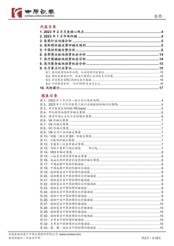 本报告的核心观点是:2023年2月,新冠病毒传播速度放缓,医药行业投资机会主要集中在以下几个领域:创新中药、国产医疗器械和CXO板块。此外,眼科领域也值得关注。报告同时分析了1月份医药市场表现、行业估值、原料药及中药材价格走势,并对未来走势进行了预测。