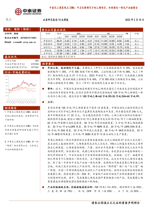 中泰化工周度观点23W6:中石化新增百万吨乙烯项目,加快炼化一体化产业链整合