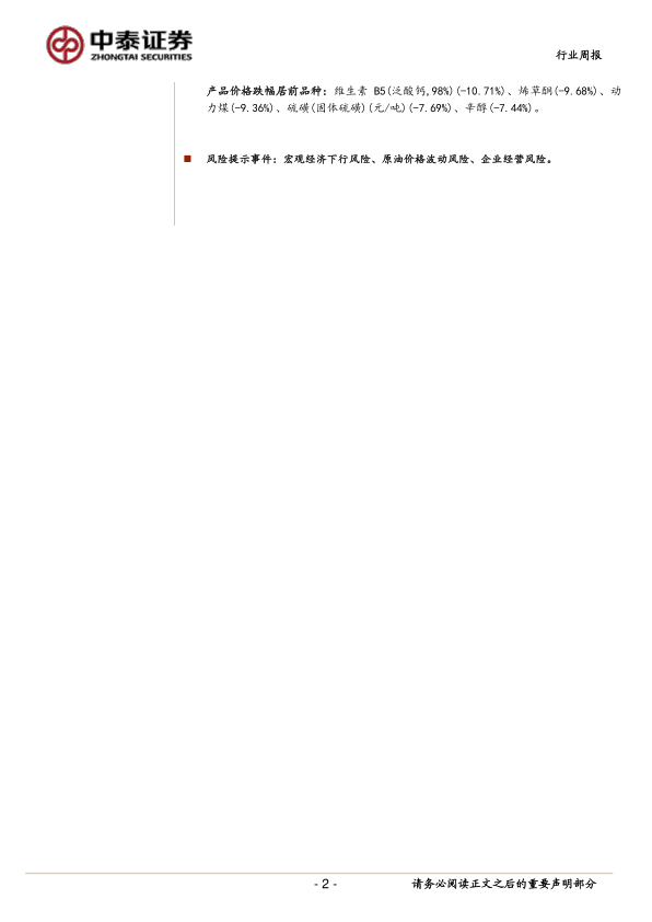 产品价格跌幅居前品种:维生素B5(泛酸钙,98%)(-10.71%)、烯草酮(-9.68%)、动力煤(-9.36%)、硫磺(固体硫磺)(元/吨)(-7.69%)、辛醇(-7.44%)。