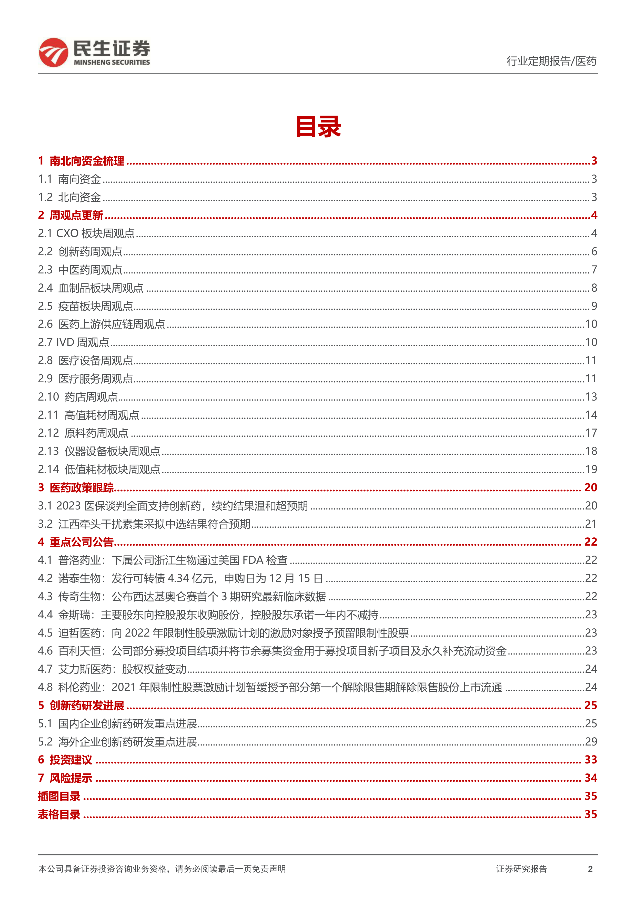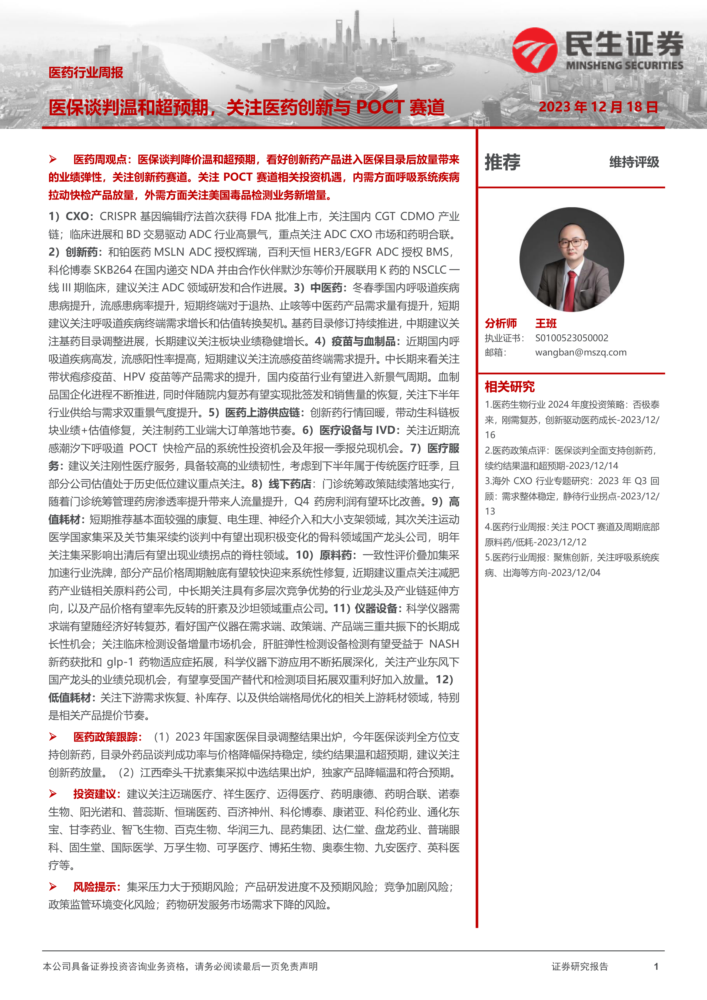 风险提示: 集采压力大于预期风险;产品研发进度不及预期风险;竞争加剧风险;政策监管环境变化风险;药物研发服务市场需求下降的风险。