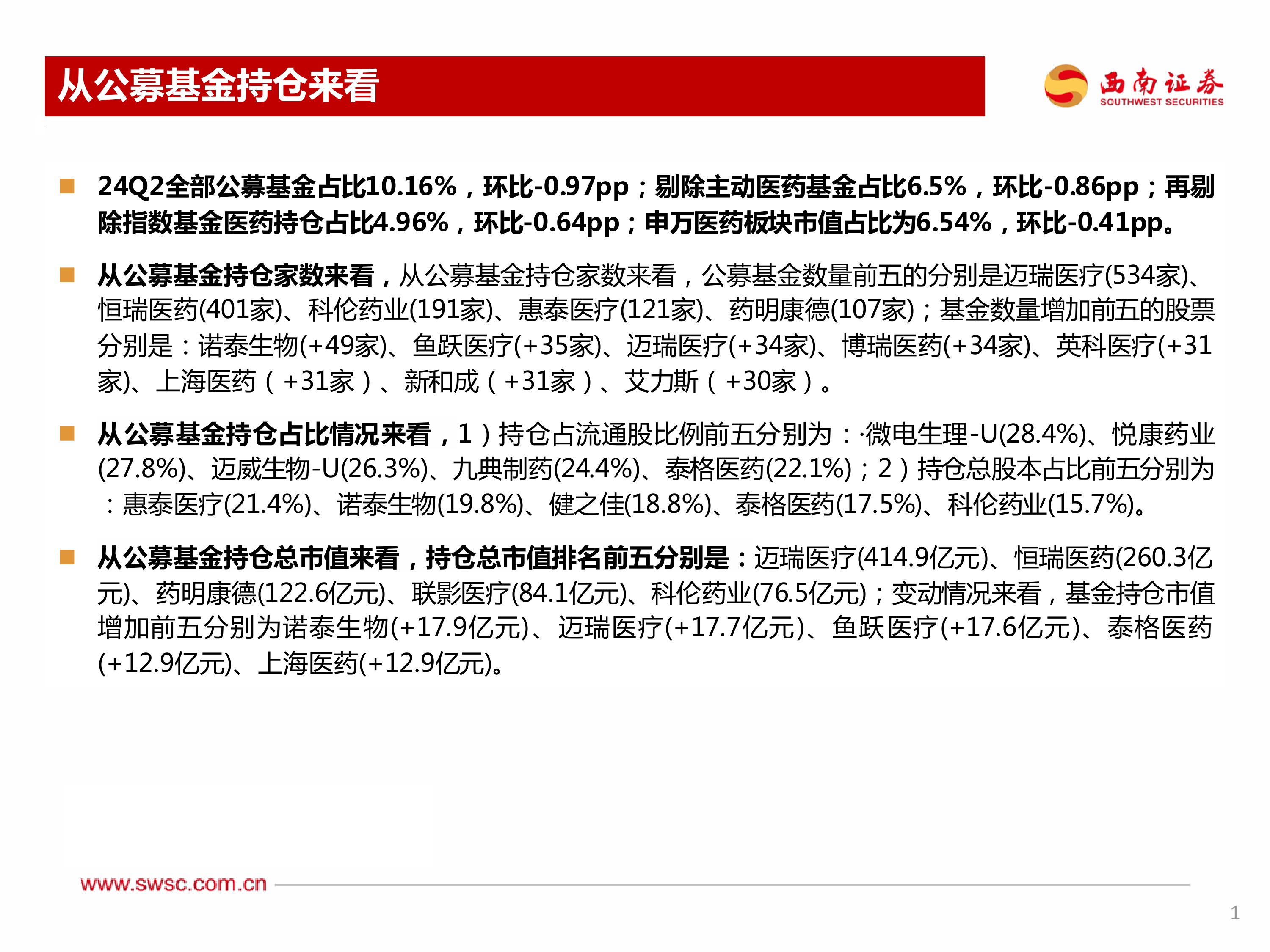 本报告主要从公募基金持仓和陆股通持仓两个方面,对2024Q2医药行业投资市场进行数据分析。