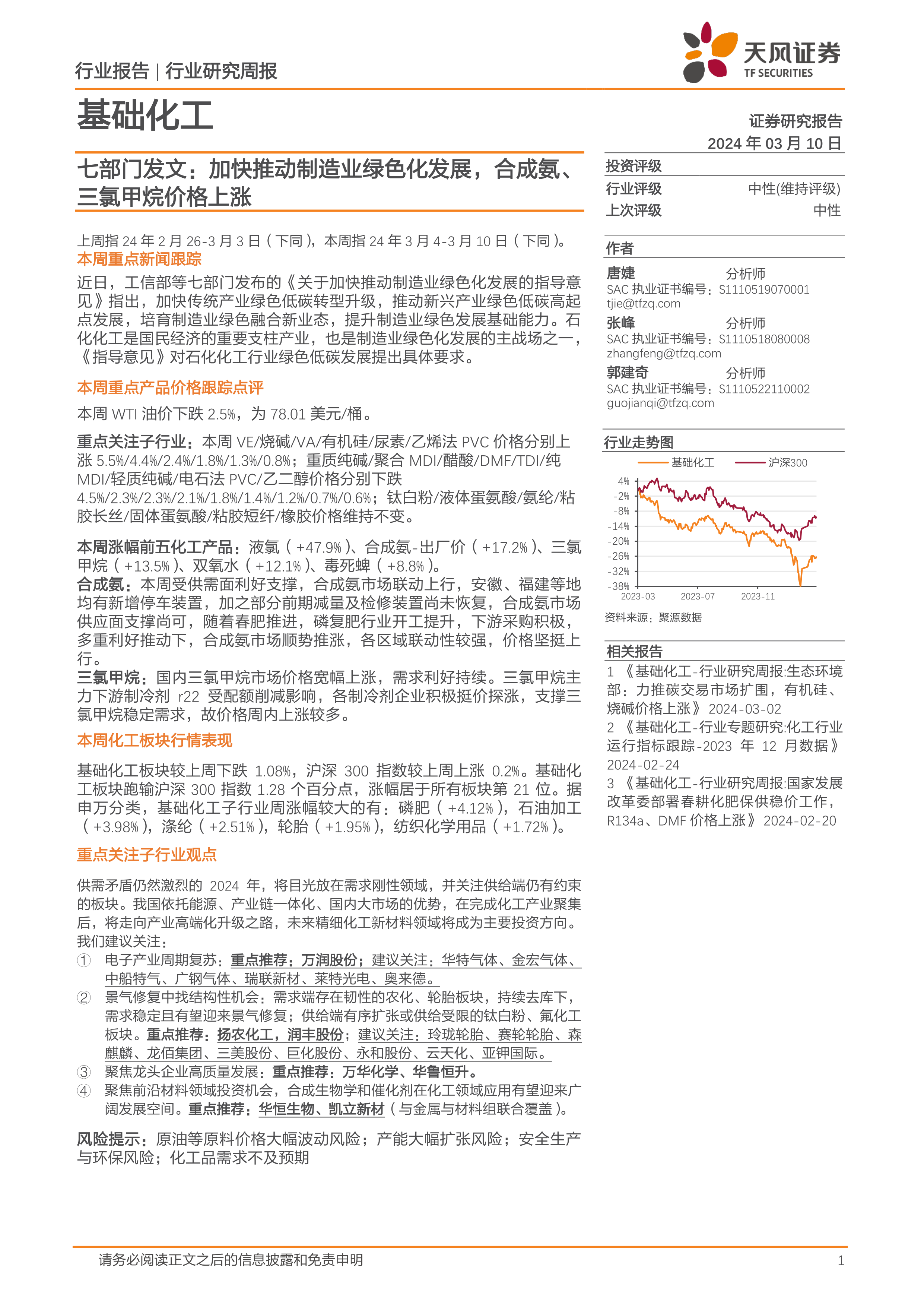 基础化工行业七天部门发文:加快推动制造业绿色化发展,合成氨、三氯甲烷价格上涨