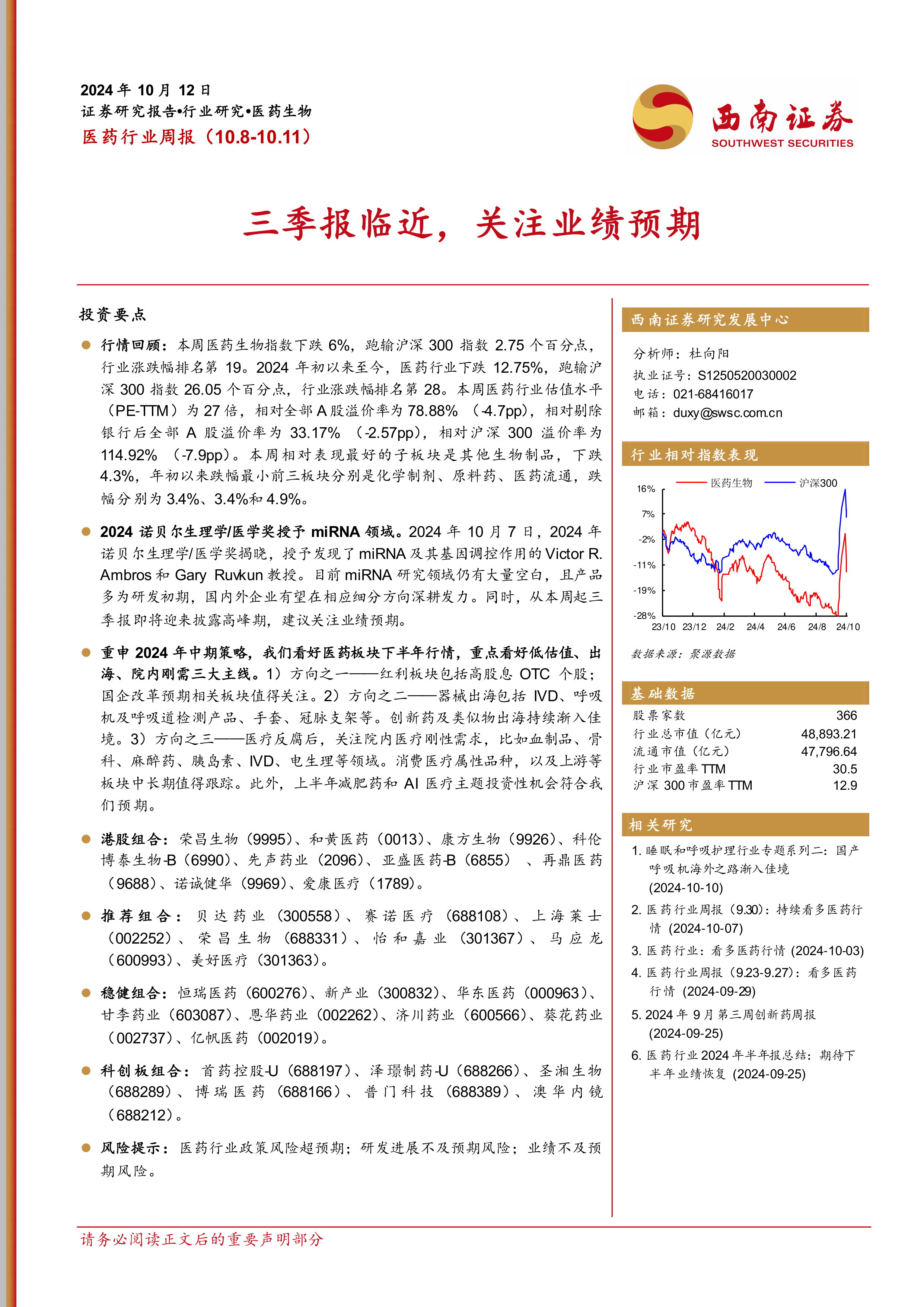 2024诺贝尔生理学/医学奖授予miRNA领域。2024年10月7日,2024年诺贝尔生理学/医学奖揭晓,授予发现了miRNA及其基因调控作用的Victor R.Ambros和Gary Ruvkun教授。目前miRNA研究领域仍有大量空白,且产品多为研发初期,国内外企业有望在相应细分方向深耕发力。同时,从本周起三季报即将迎来披露高峰期,建议关注业绩预期。