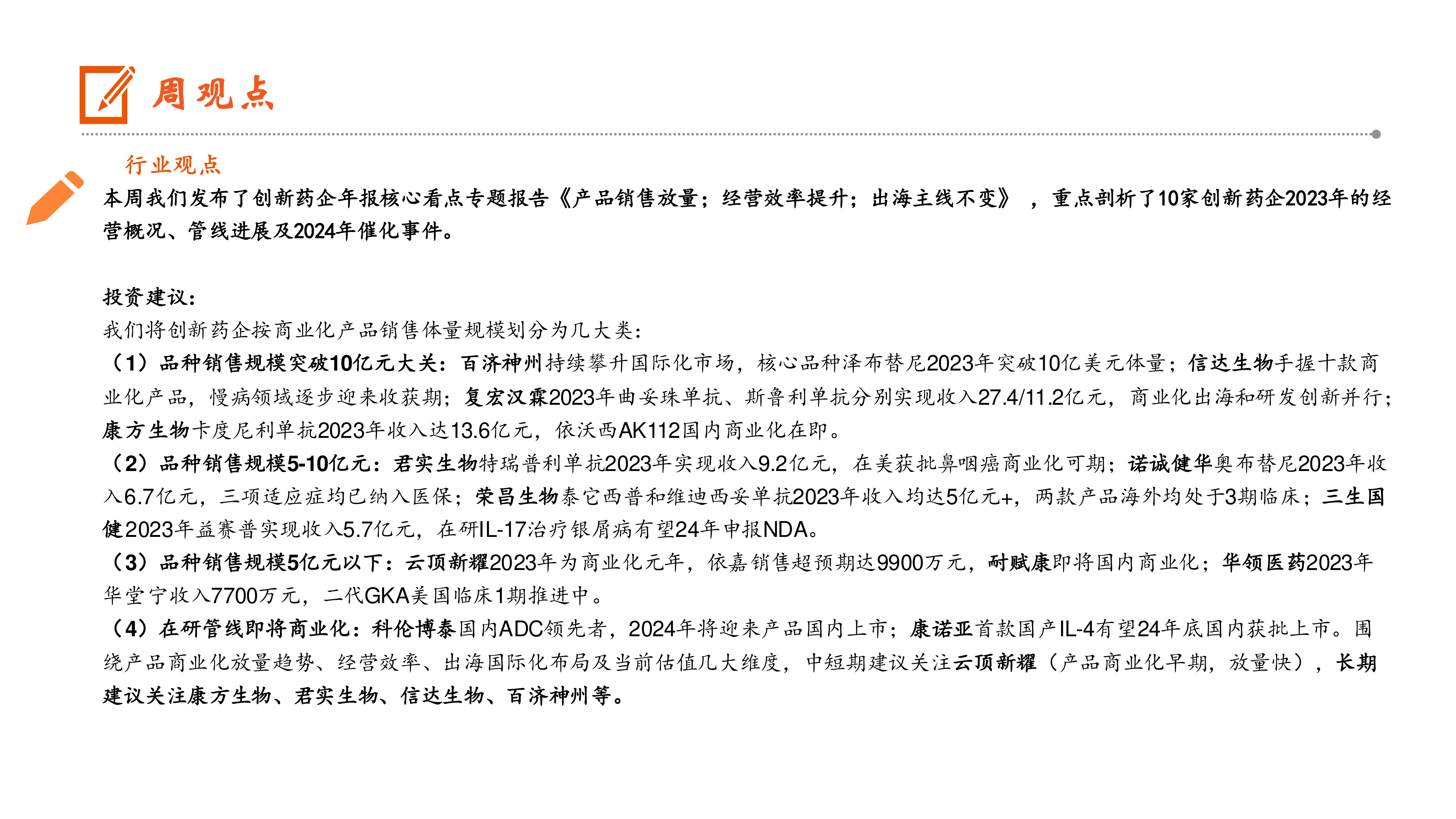 本周我们发布了创新药企年报核心看点专题报告《产品销售放量;经营效率提升;出海主线不变》,重点剖析了10家创新药企2023年的经营概况、管线进展及2024年催化事件。