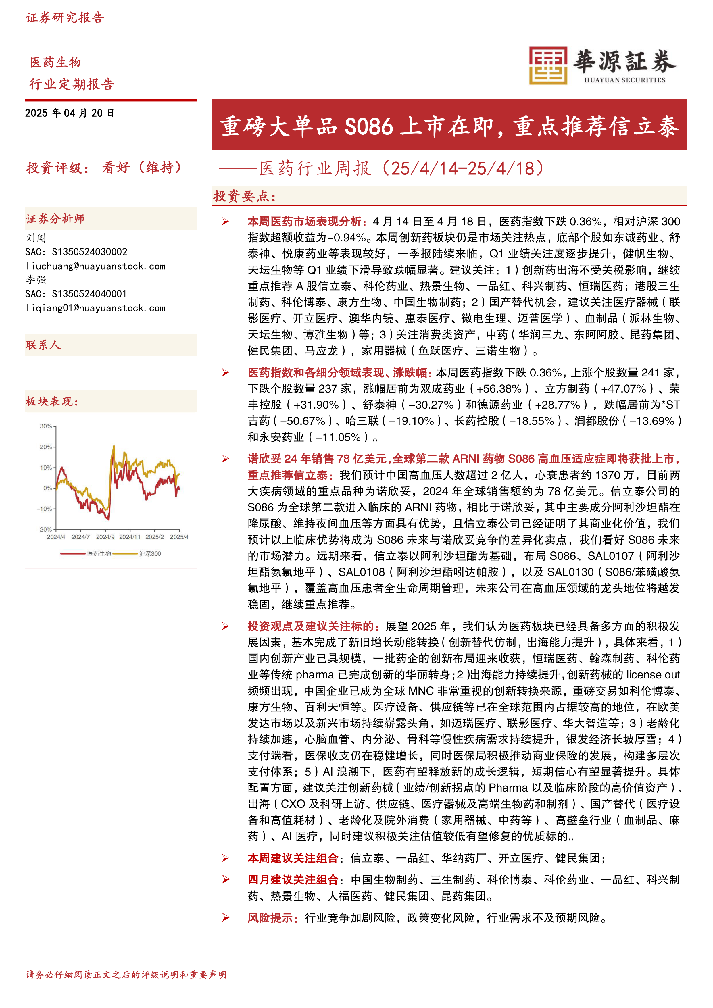 本报告重点推荐信立泰公司及其即将上市的ARNI类药物S086,并对S086的市场潜力进行了深入分析。同时,报告对医药行业整体市场表现进行了全面的分析,并基于“创新+出海+老龄化”的主线,提出了2025年医药行业的投资建议,为投资者提供了重要的参考信息。报告也指出了医药行业面临的风险,提醒投资者谨慎投资。 报告数据翔实,分析透彻,为投资者提供了专业的投资建议。 但需注意,报告中的投资建议仅供参考,投资者应根据自身情况进行独立判断。