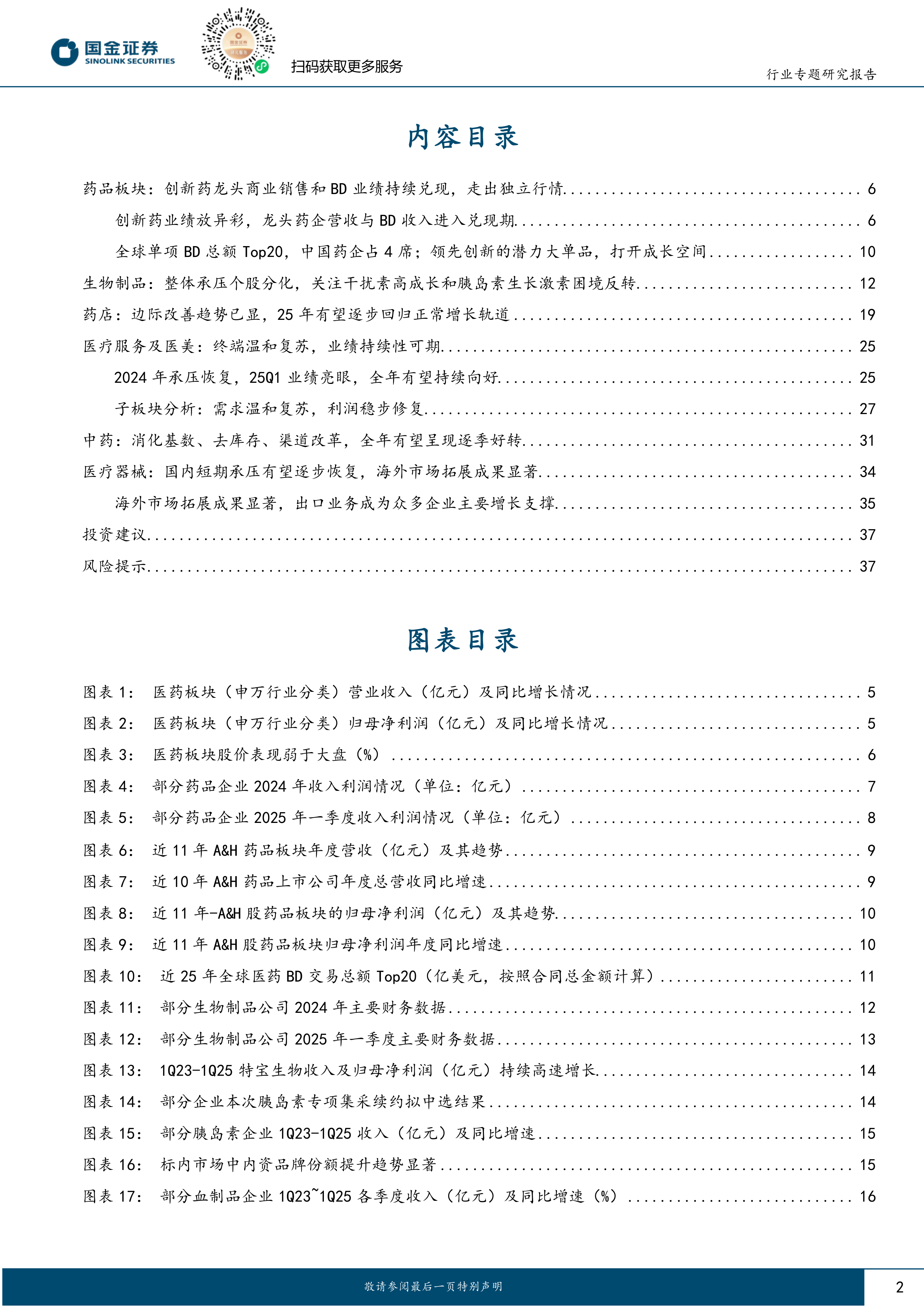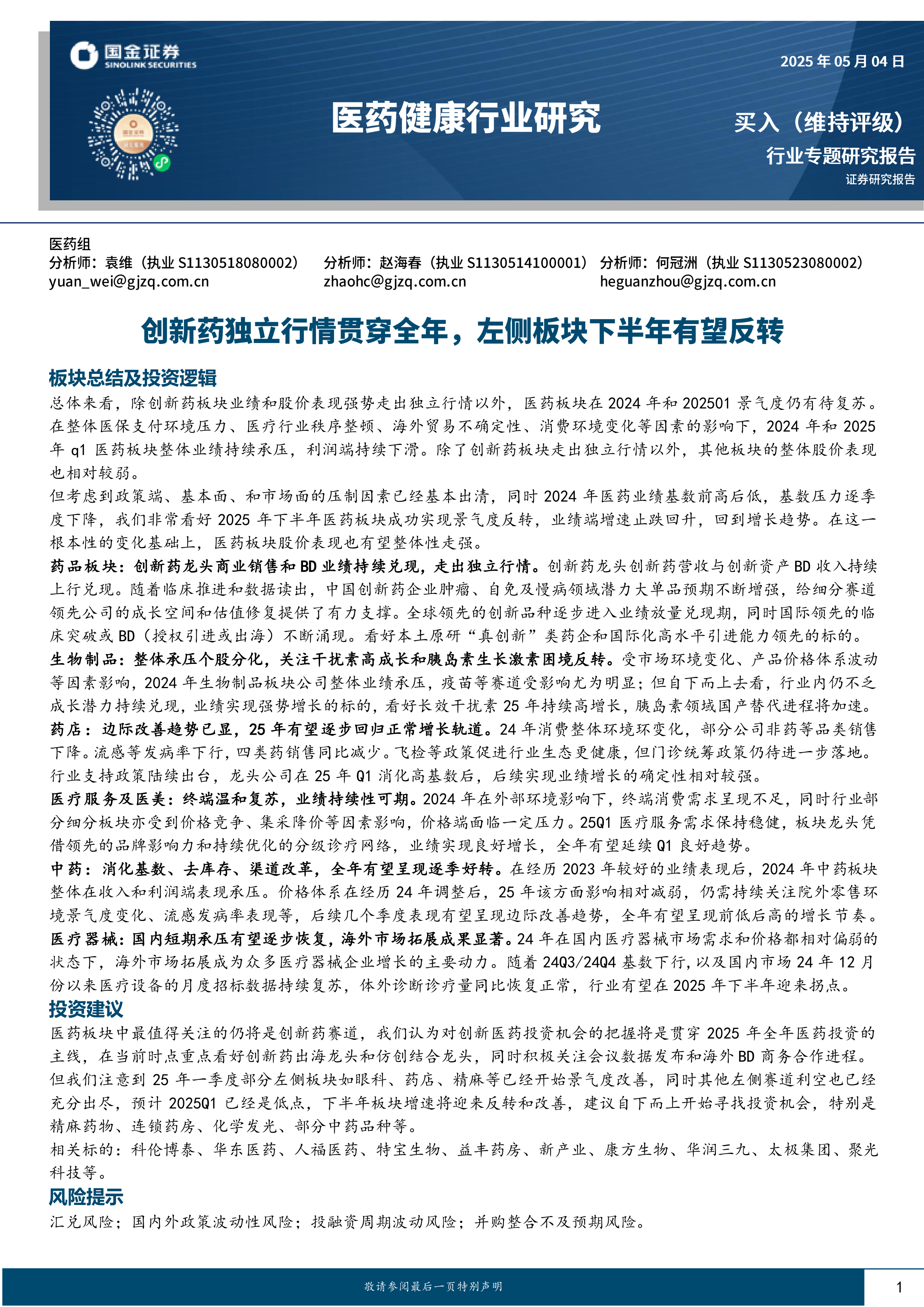 药品板块:创新药龙头商业销售和BD业绩持续兑现,走出独立行情。创新药龙头创新药营收与创新资产BD收入持续上行兑现。随着临床推进和数据读出,中国创新药企业肿瘤、自免及慢病领域潜力大单品预期不断增强,给细分赛道领先公司的成长空间和估值修复提供了有力支撑。全球领先的创新品种逐步进入业绩放量兑现期,同时国际领先的临床突破或BD(授权引进或出海)不断涌现。看好本土原研“真创新”类药企和国际化高水平引进能力领先的标的。生物制品:整体承压个股分化,关注干扰素高成长和胰岛素生长激素困境反转。受市场环境变化、产品价格体系波动等因素影响,2024年生物制品板块公司整体业绩承压,疫苗等赛道受影响尤为明显;但自下而上去看,行业内仍不乏成长潜力持续兑现,业绩实现强势增长的标的,看好长效干扰素25年持续高增长,胰岛素领域国产替代进程将加速。药店:边际改善趋势已显,25年有望逐步回归正常增长轨道。24年消费整体环境环变化,部分公司非药等品类销售下降。流感等发病率下行,四类药销售同比减少。飞检等政策促进行业生态更健康,但门诊统筹政策仍待进一步落地。行业支持政策陆续出台,龙头公司在25年Q1消化高基数后,后续实现业绩增长的确定性相对较强。