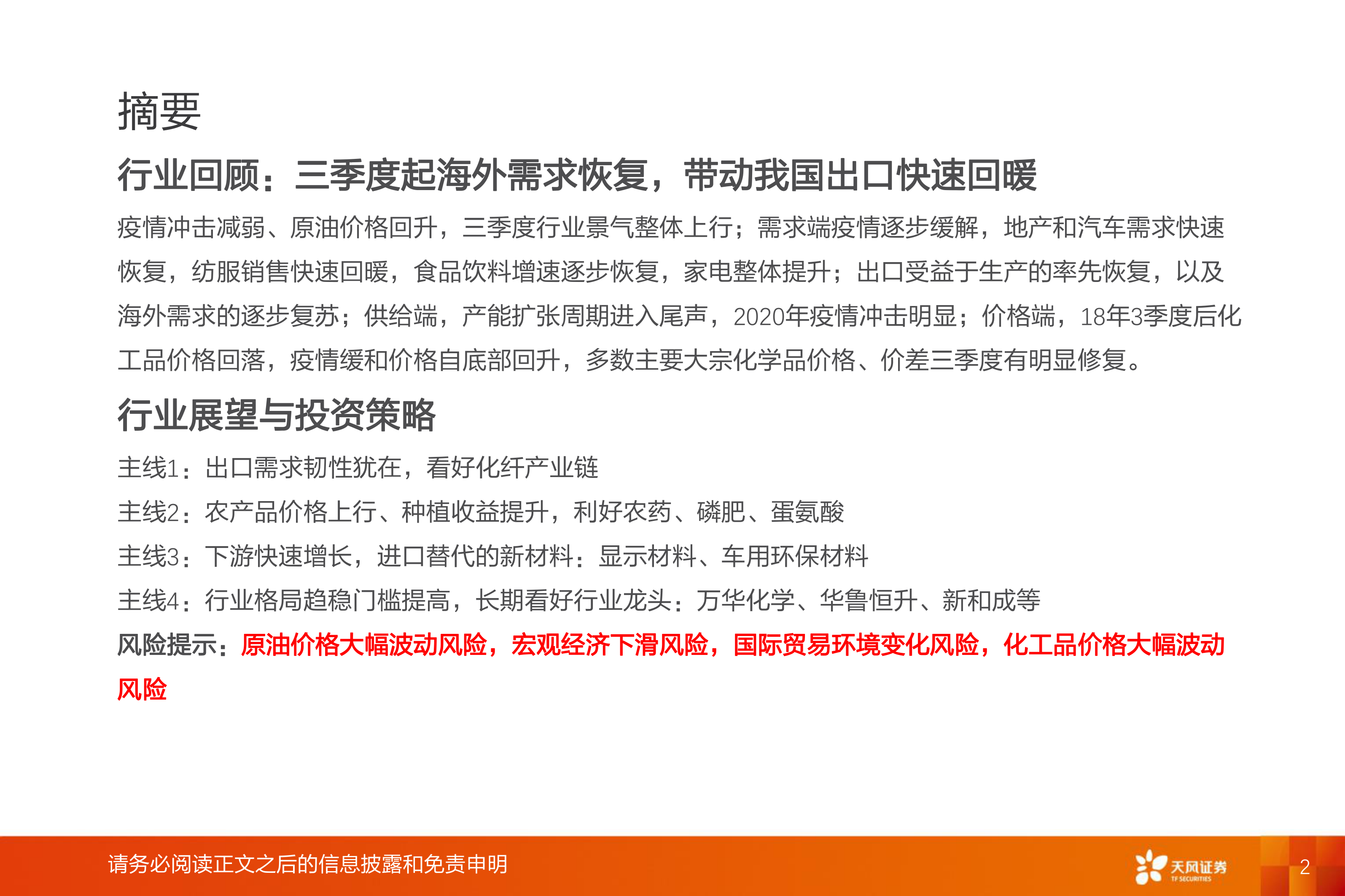 本报告基于对2020年前三季度中国化工行业数据的分析,预测了未来行业发展趋势,并提出了相应的投资策略。报告认为,出口复苏和国内需求回暖将继续推动行业景气度上行,化纤产业链、农化产品、进口替代新材料以及行业龙头企业将是未来投资的重点方向。 报告同时提醒投资者关注原油价格波动、宏观经济环境变化以及国际贸易环境等风险因素。 报告中推荐的个股仅供参考,投资者应根据自身情况进行独立判断。