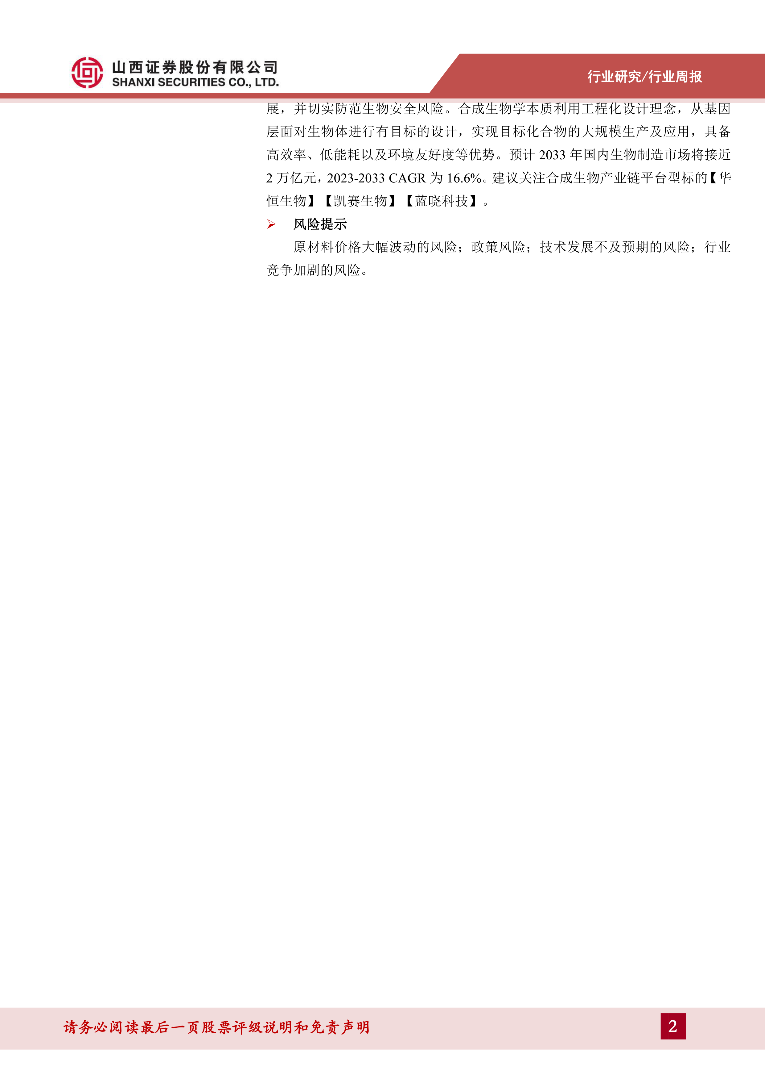 2)市场监管总局调研座谈支持合成生物产业发展,关注平台型龙头标的。2024年10月18日,市场监管总局在天津开展合成生物促进发展和科学监管的调研座谈,表明未来国家将采取有针对性举措,积极推进合成生物产业健康发展,并切实防范生物安全风险。合成生物学本质利用工程化设计理念,从基因层面对生物体进行有目标的设计,实现目标化合物的大规模生产及应用,具备高效率、低能耗以及环境友好度等优势。预计2033年国内生物制造市场将接近2万亿元,2023-2033CAGR为16.6%。建议关注合成生物产业链平台型标的【华恒生物】【凯赛生物】【蓝晓科技】。