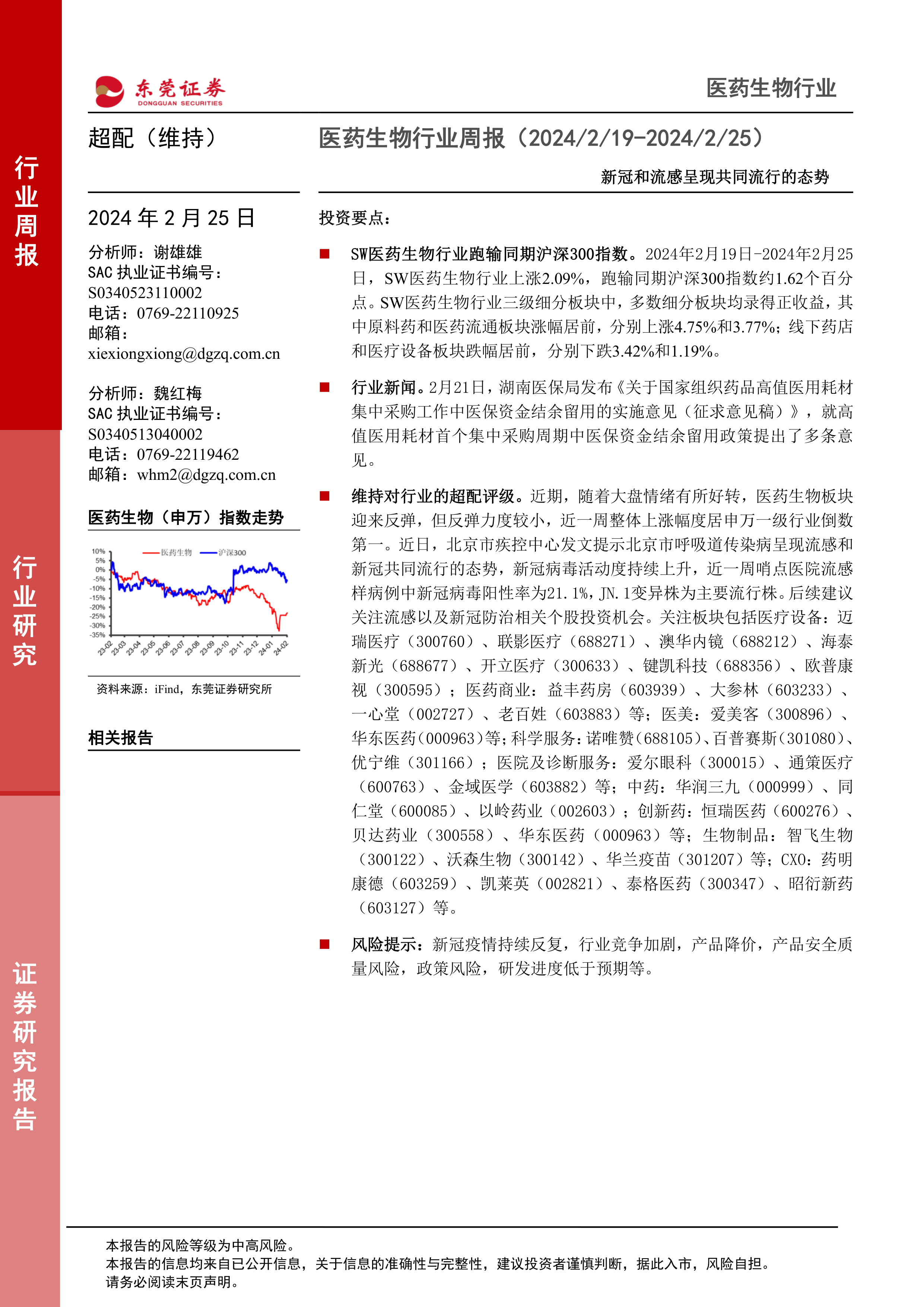 本报告对2024年2月19日至2024年2月25日期间SW医药生物行业的表现进行了全面分析,指出尽管行业整体跑输沪深300指数,但多数细分板块和个股仍录得正收益,行业估值处于相对低位。 北京市呼吸道传染病的流行态势为流感和新冠防治相关个股带来了潜在投资机会。 报告维持对行业的超配评级,并推荐了一系列个股,但同时提醒投资者需关注多种潜在风险,谨慎投资。 报告数据主要来自iFind和东莞证券研究所。