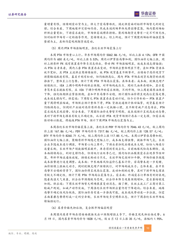 报告对多个化工细分市场进行了深入跟踪,包括国际油价、丙烷、喷吹煤、聚乙烯、聚丙烯、PTA、涤纶长丝、尿素、复合肥、聚合MDI、TDI、磷矿石、EVA、纯碱、钛白粉以及制冷剂R134a和R32等。 对于每个细分市场,报告都详细分析了其价格波动的原因,包括供需关系、成本变化、地缘政治因素以及行业政策等。
