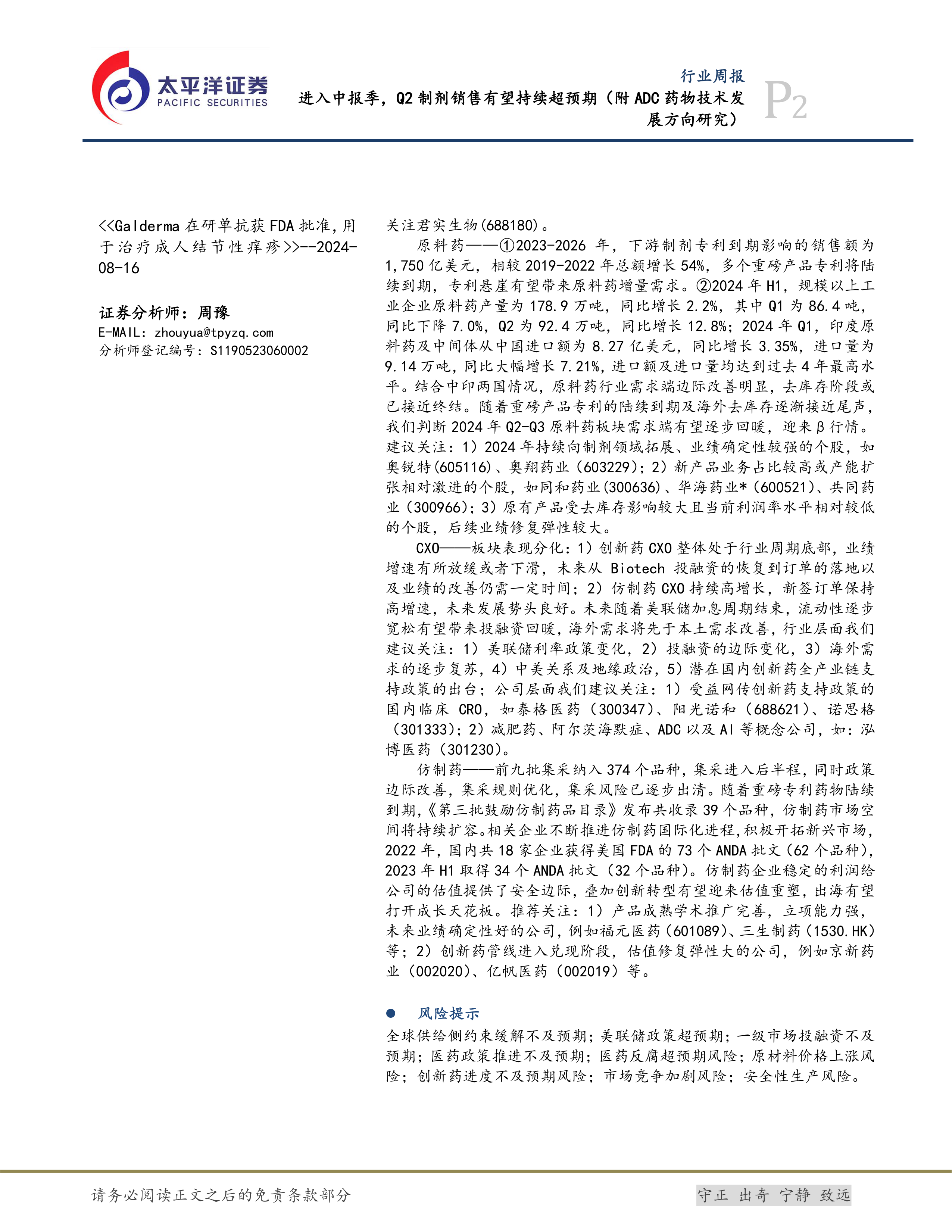 本报告的核心观点是:医药行业进入中报季,Q2制剂销售有望持续超预期,创新药、体外诊断、血制品板块表现较好。ADC药物技术持续发展,新一代技术平台可期,值得关注。同时,报告也分析了原料药、CXO和仿制药等细分领域的市场表现和投资机会,并提示了相应的风险。