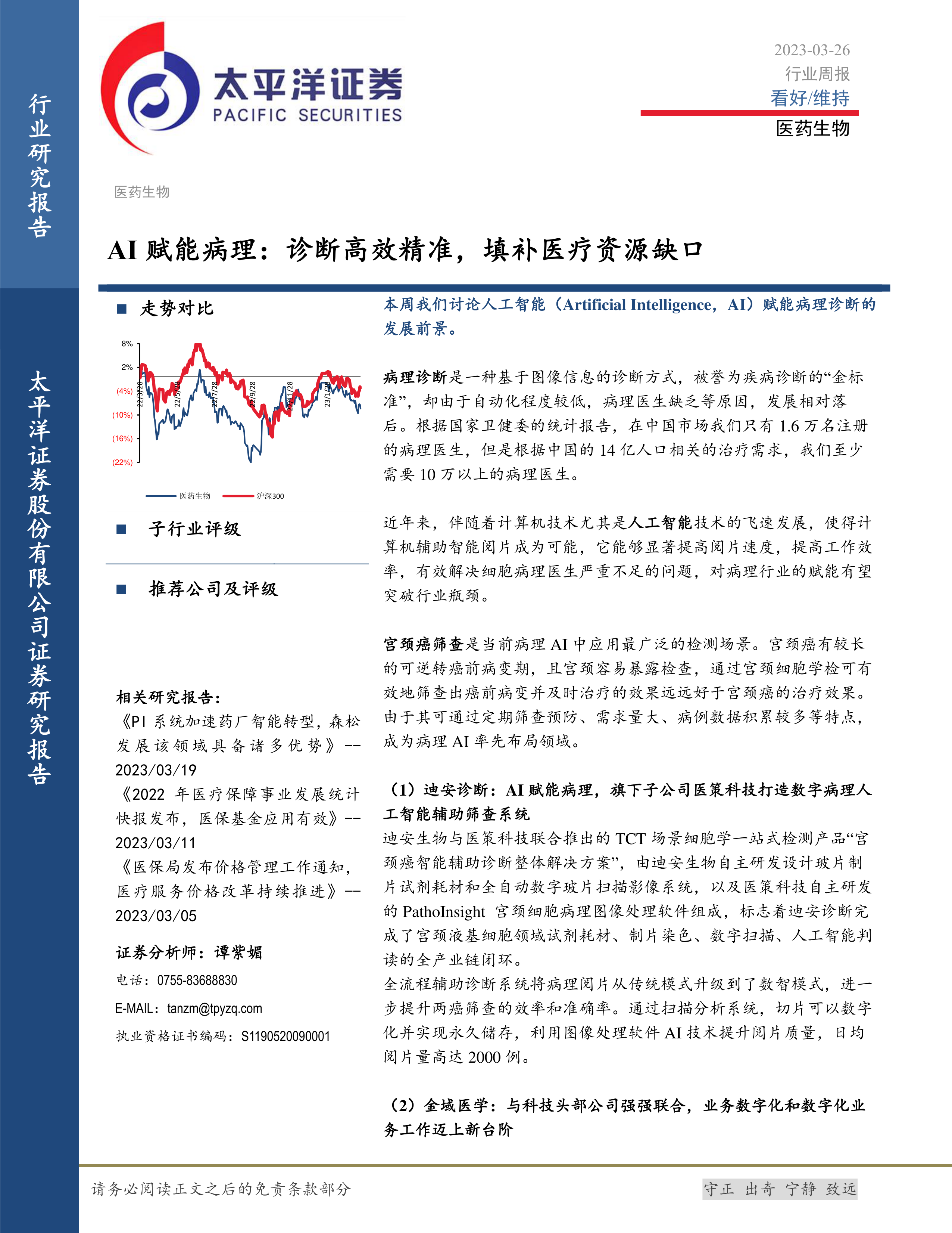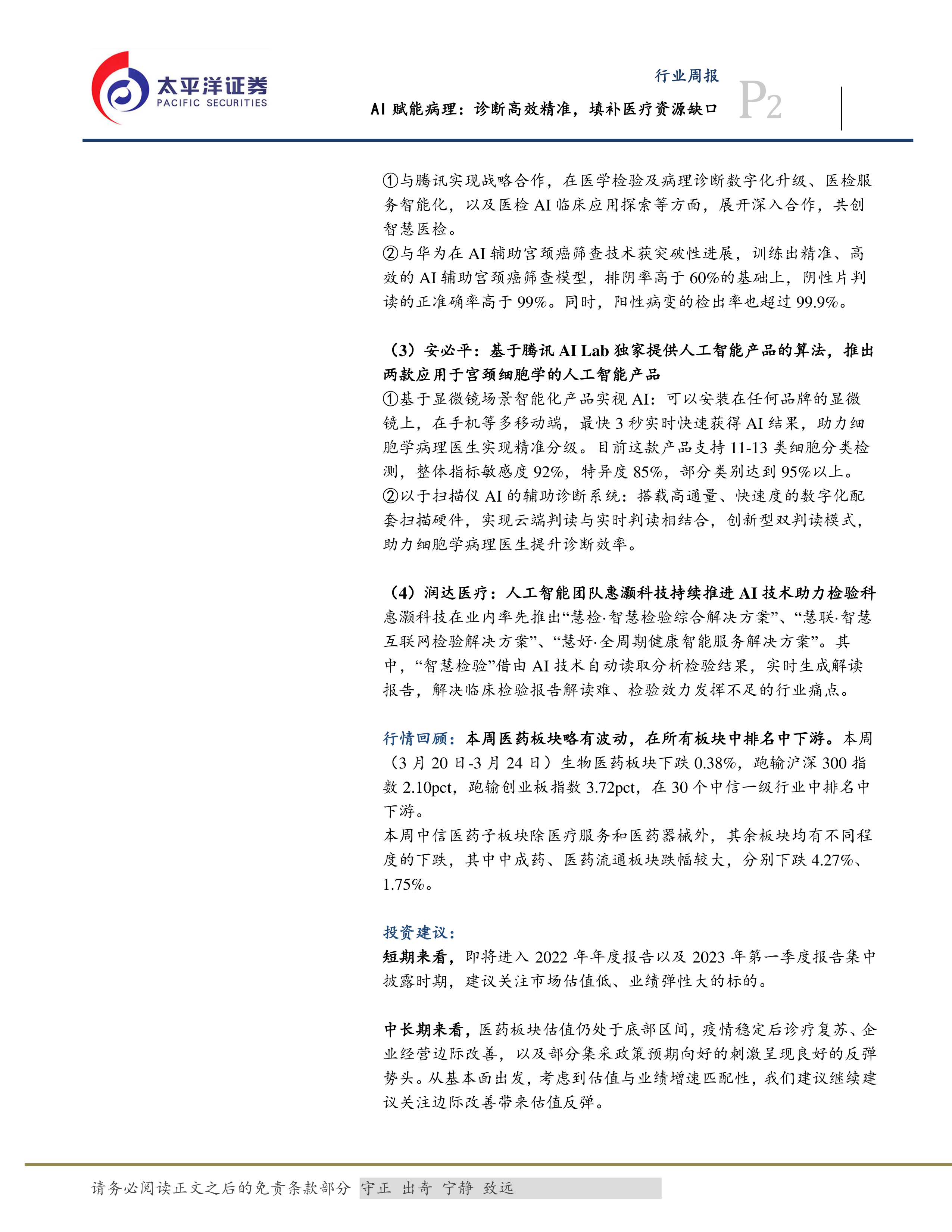 本报告通过数据和案例分析,阐述了AI技术赋能病理诊断的巨大潜力,并对相关上市公司的发展现状和投资价值进行了评估。 AI技术在提高诊断效率和准确性方面展现出显著优势,尤其在宫颈癌筛查等领域已经取得了显著成果。 短期来看,建议关注估值低、业绩弹性大的标的;中长期来看,随着疫情影响消退和行业复苏,医药板块有望迎来良好的投资机会。 然而,投资者仍需关注政策风险、价格风险等潜在风险。