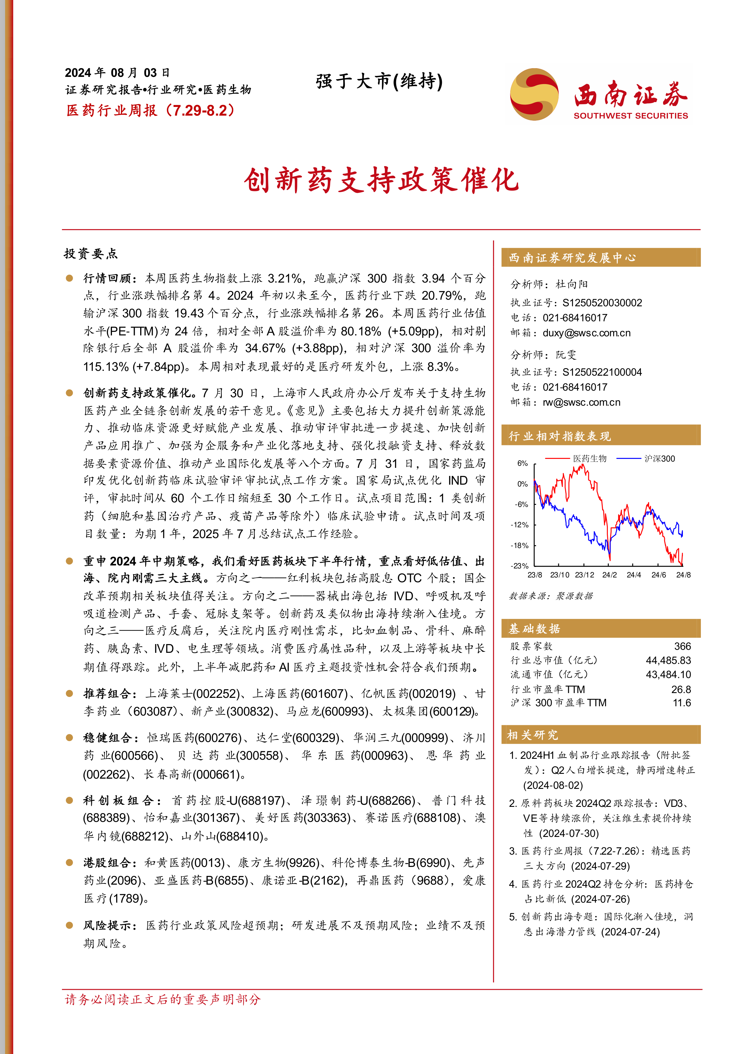 本报告以医药行业周报(7.29-8.8)为基础,涵盖了以下主要内容:
