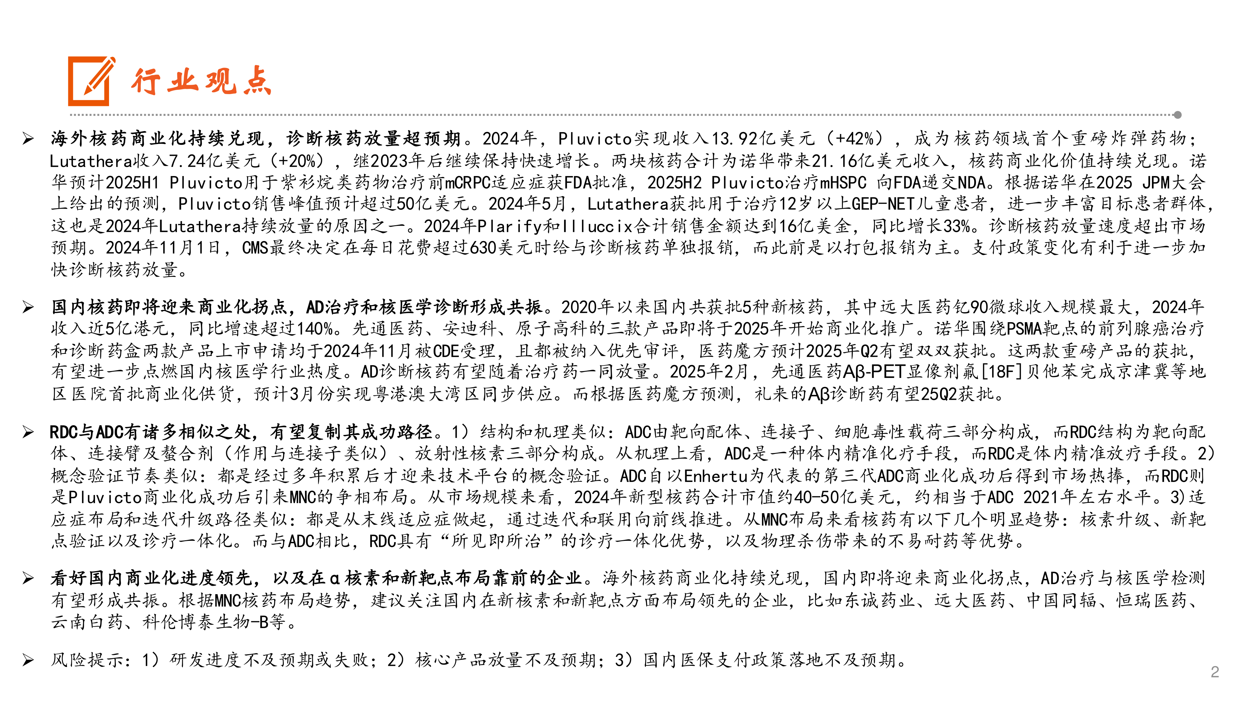 海外核药商业化持续兑现,诊断核药放量超预期。2024年,Pluvicto实现收入13.92亿美元(+42%),成为核药领域首个重磅炸弹药物;Lutathera收入7.24亿美元(+20%),继2023年后继续保持快速增长。两块核药合计为诺华带来21.16亿美元收入,核药商业化价值持续兑现。诺华预计2025H1Pluvicto用于紫衫烷类药物治疗前mCRPC适应症获FDA批准,2025H2Pluvicto治疗mHSPC向FDA递交NDA。根据诺华在2025JPM大会上给出的预测,Pluvicto销售峰值预计超过50亿美元。2024年5月,Lutathera获批用于治疗12岁以上GEP-NET儿童患者,进一步丰富目标患者群体,这也是2024年Lutathera持续放量的原因之一。2024年Plarify和Illuccix合计销售金额达到16亿美金,同比增长33%。诊断核药放量速度超出市场预期。2024年11月1日,CMS最终决定在每日花费超过630美元时给与诊断核药单独报销,而此前是以打包报销为主。支付政策变化有利于进一步加快诊断核药放量。