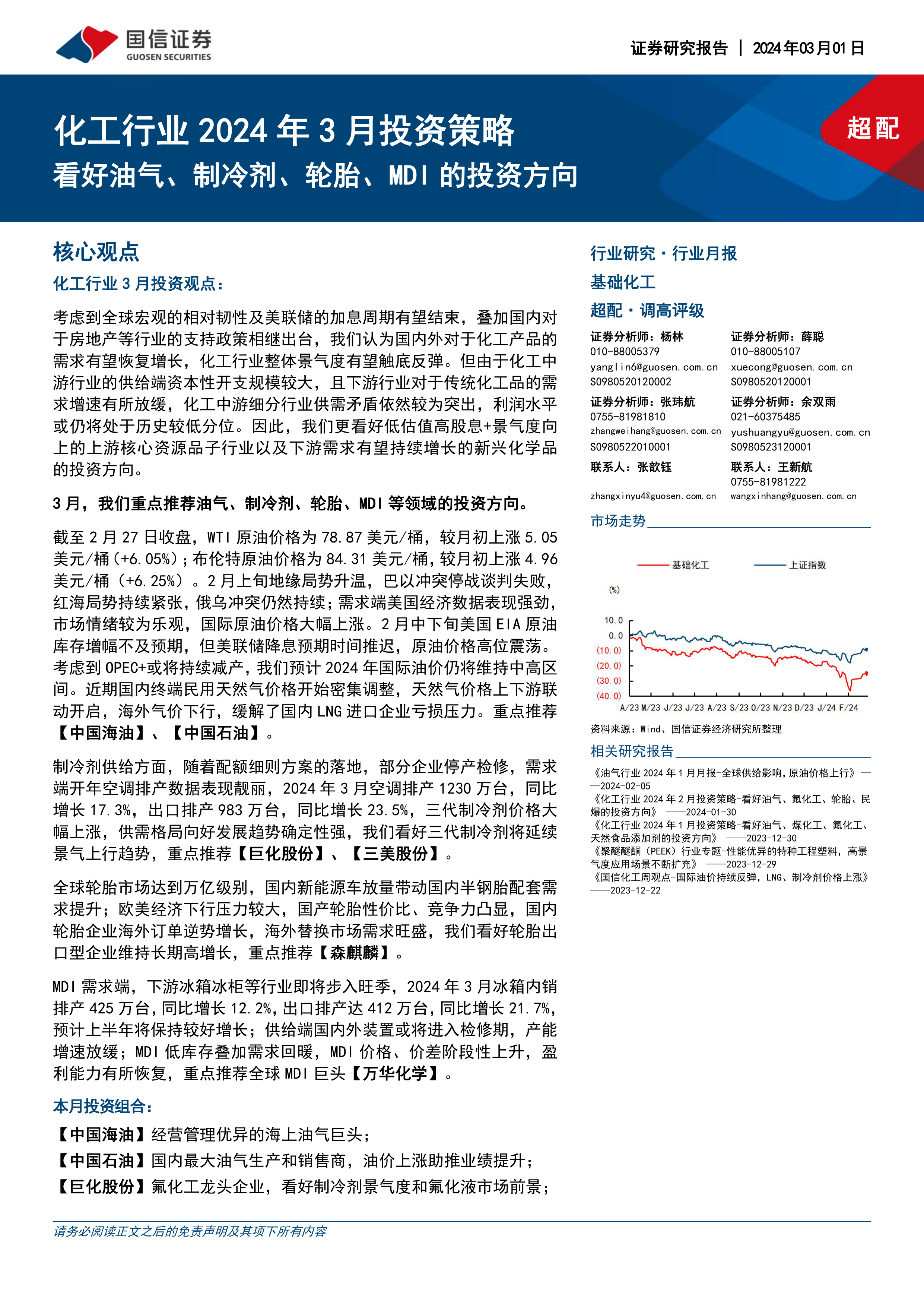 化工行业2024年3月投资策略:看好油气、制冷剂、轮胎、MDI的投资方向