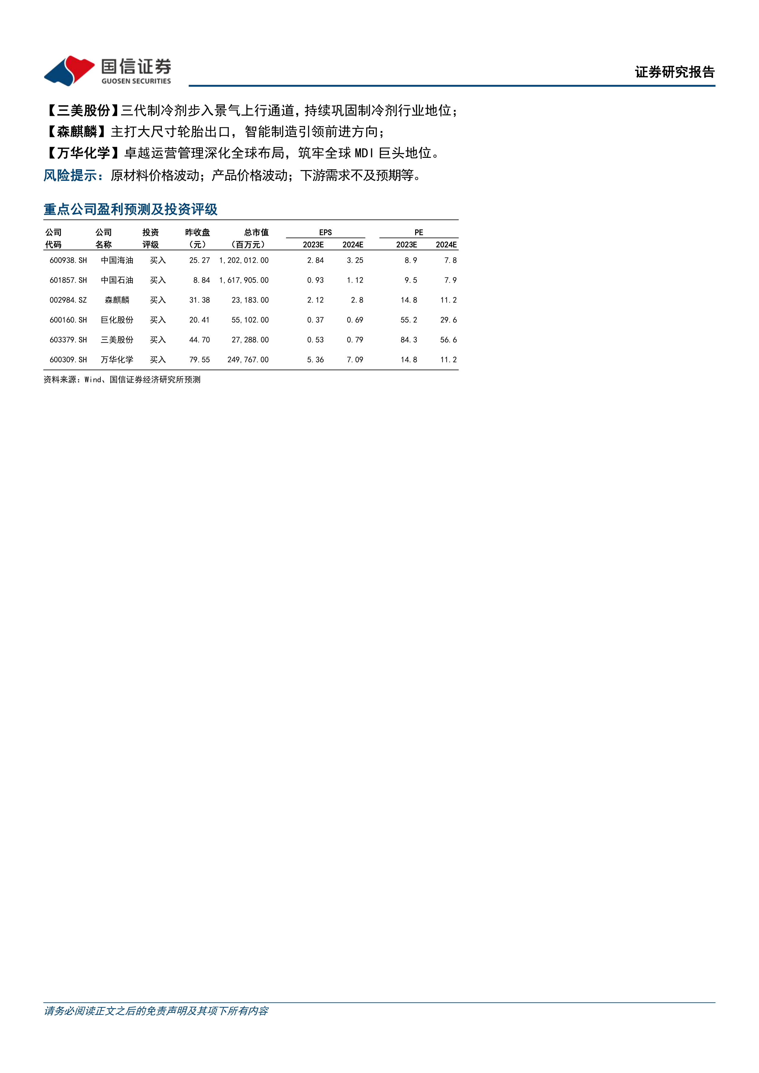 报告重点推荐油气、制冷剂、轮胎和MDI四个领域,并分别给出了相应的投资标的,例如中国海油、中国石油、巨化股份、三美股份、森麒麟和万华化学等。