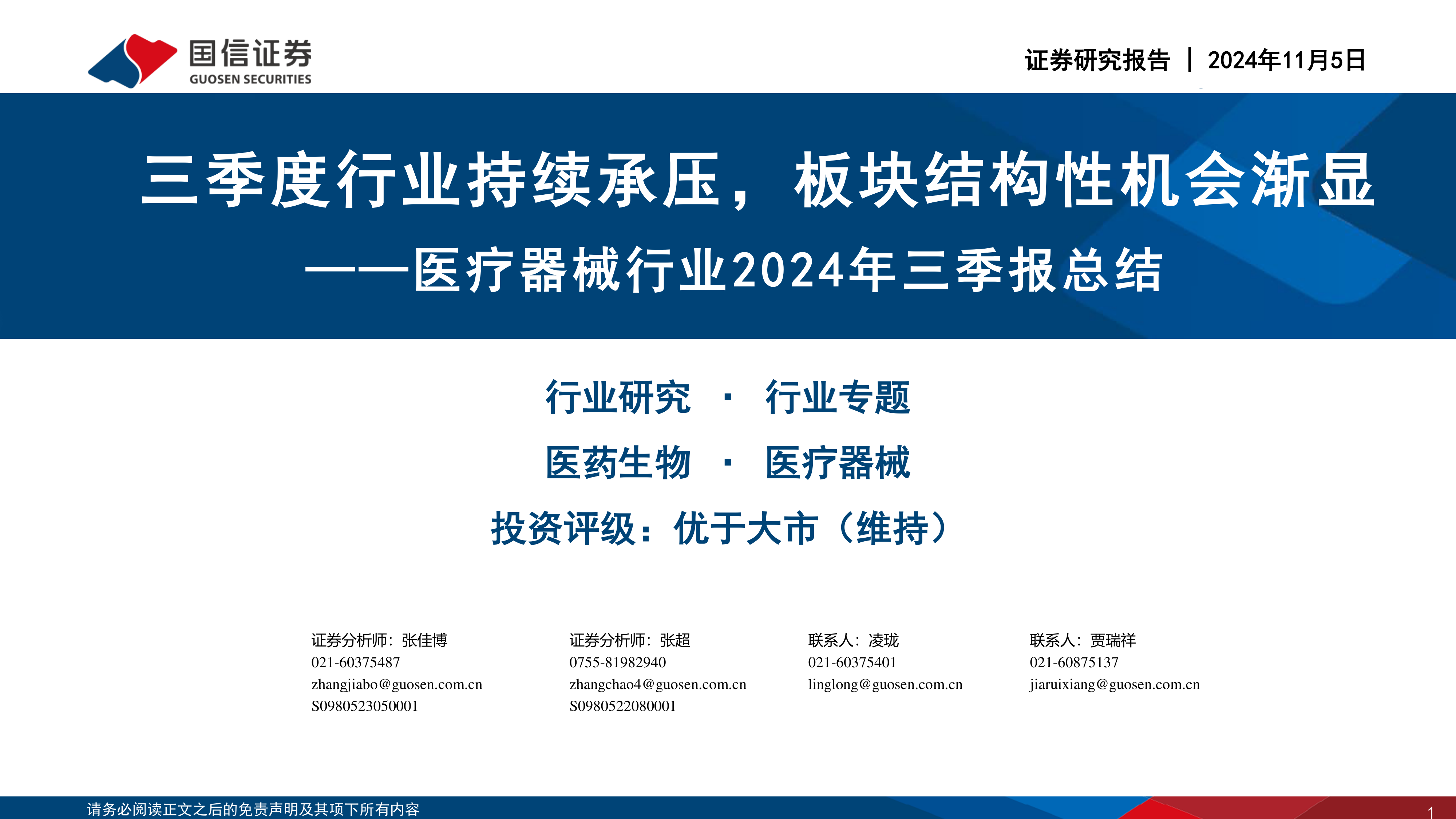 医疗器械行业2024年三季报总结:三季度行业持续承压,板块结构性机会渐显