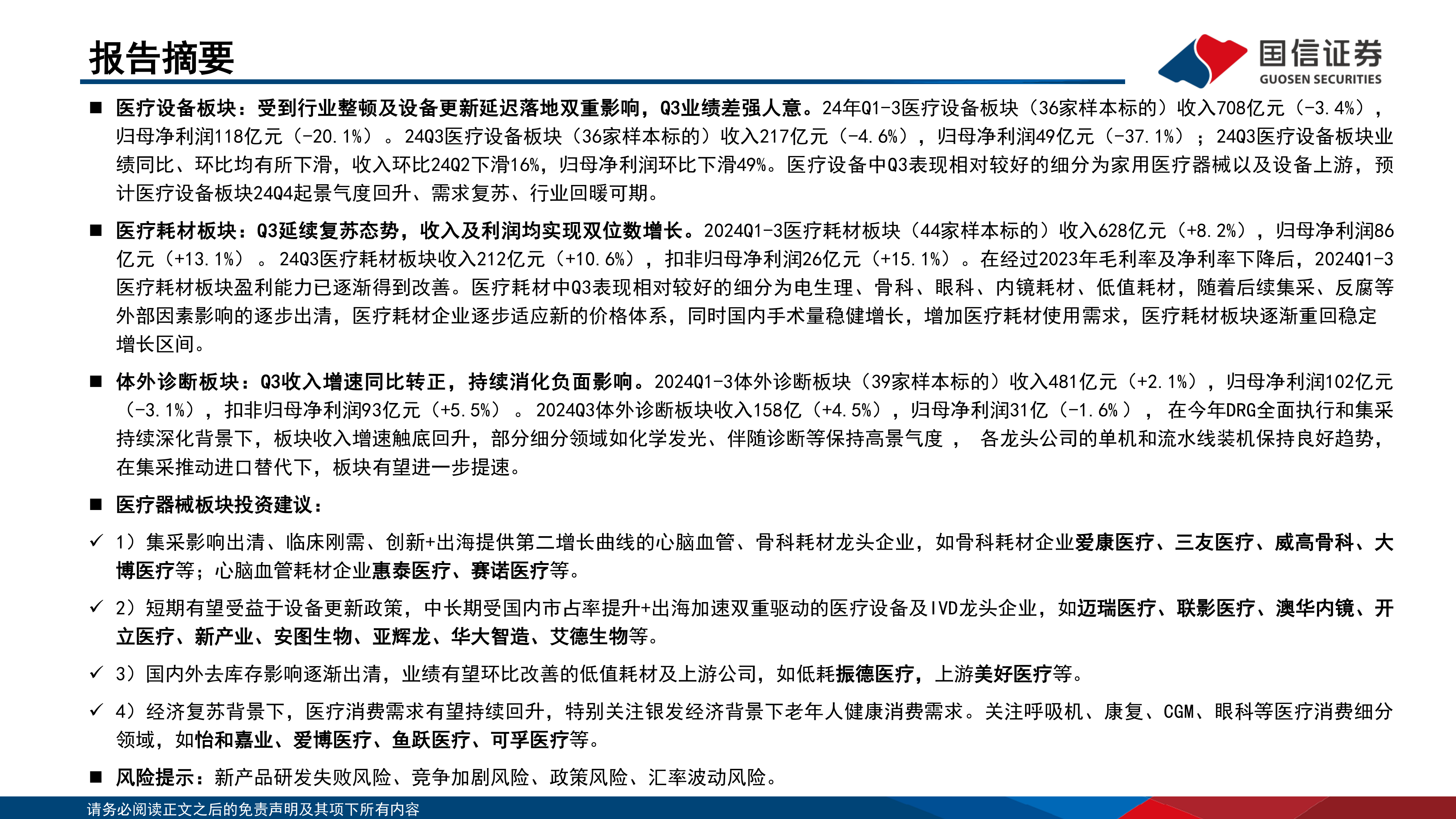 本报告的核心观点是:2024年三季度,医疗器械行业整体承压,但板块内结构性机会渐显。医疗设备板块受行业整顿和设备更新政策落地缓慢影响,业绩表现差强人意,预计2024年四季度开始景气度回升;医疗耗材板块延续复苏态势,收入和利润均实现双位数增长;体外诊断板块收入增速同比转正,持续消化负面影响。 报告建议关注具备以下特征的企业:集采影响出清、临床刚需、创新+出海的龙头企业;短期受益于设备更新政策,中长期受益于国内市占率提升和出海加速的龙头企业;国内外去库存影响逐渐出清,业绩有望环比改善的低值耗材及上游公司;以及受益于经济复苏和银发经济的医疗消费细分领域企业。