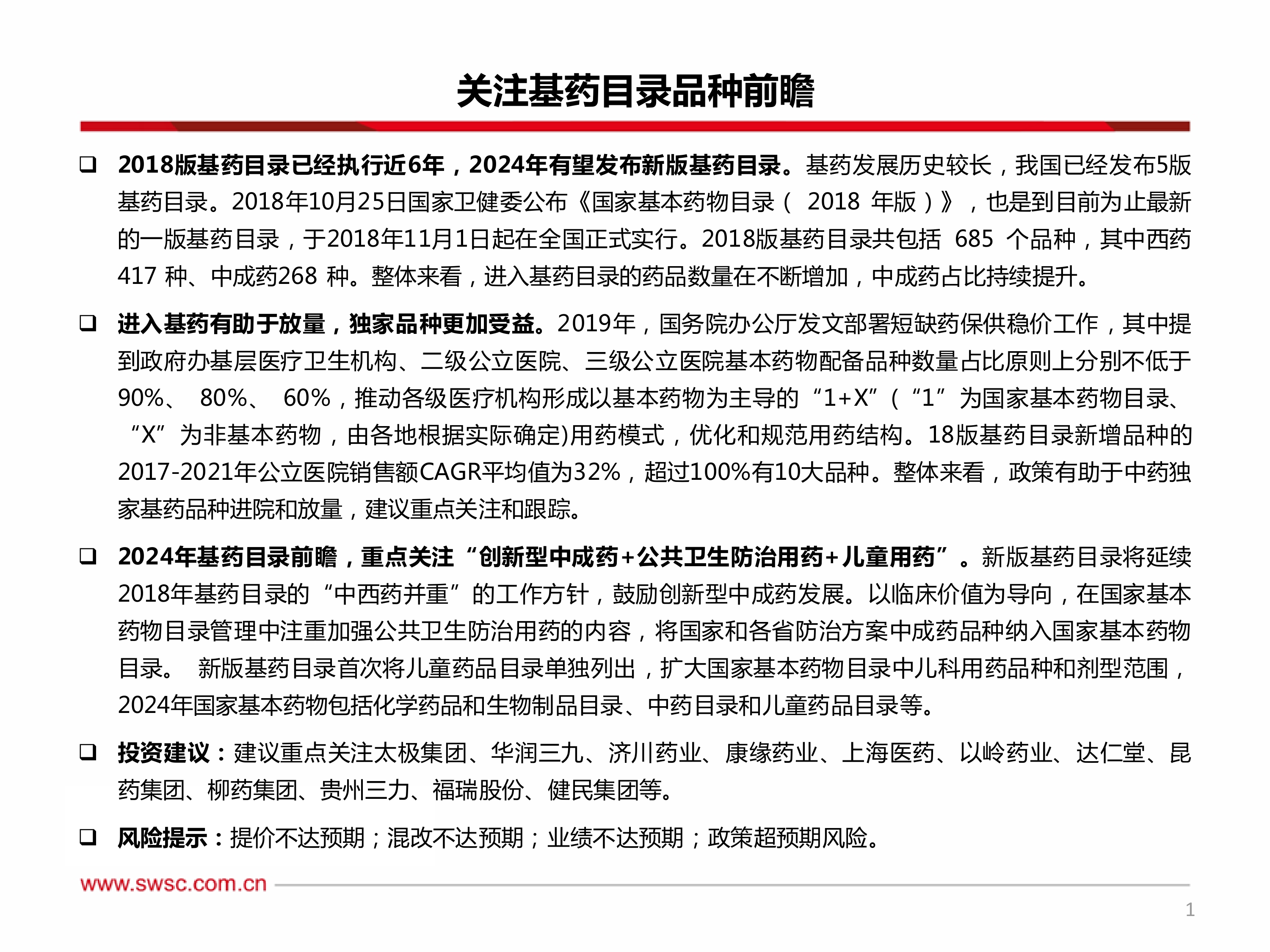 2024年基药目录前瞻,重点关注“创新型中成药+公共卫生防治用药+儿童用药”。新版基药目录将延续2018年基药目录的“中西药并重”的工作方针,鼓励创新型中成药发展。以临床价值为导向,在国家基本药物目录管理中注重加强公共卫生防治用药的内容,将国家和各省防治方案中成药品种纳入国家基本药物目录。新版基药目录首次将儿童药品目录单独列出,扩大国家基本药物目录中儿科用药品种和剂型范围,2024年国家基本药物包括化学药品和生物制品目录、中药目录和儿童药品目录等。