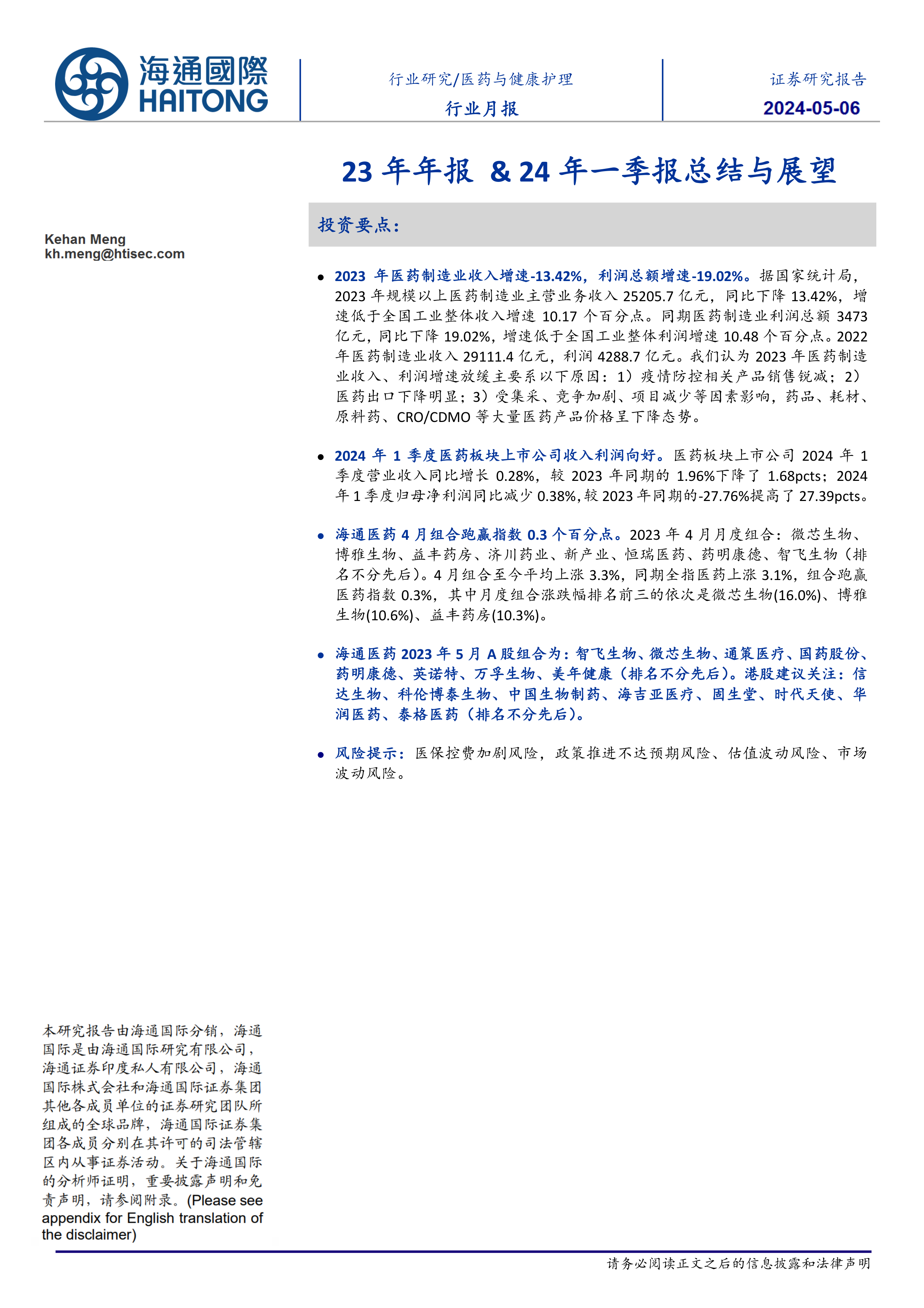 报告介绍了海通医药2023年4月和5月组合的股票构成及表现,并对组合跑赢指数的原因进行了分析。同时,报告还给出了2024年5月A股和港股的投资组合建议,并指出了潜在的投资风险,包括医保控费加剧风险、政策推进不达预期风险、估值波动风险和市场波动风险。