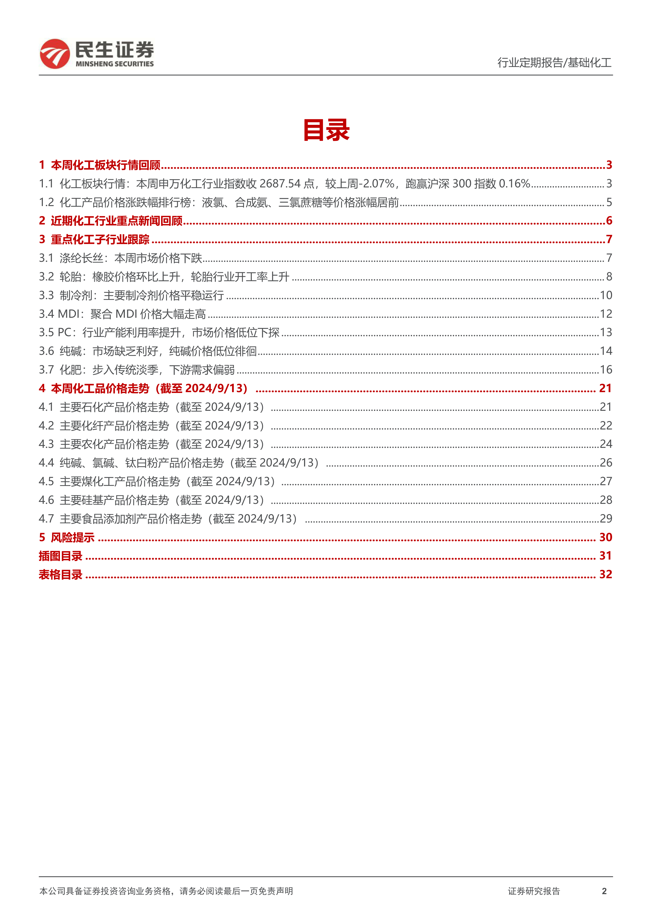 本报告详细分析了2024年9月9日至2024年9月13日化工行业市场行情,并对重点子行业进行了跟踪分析。