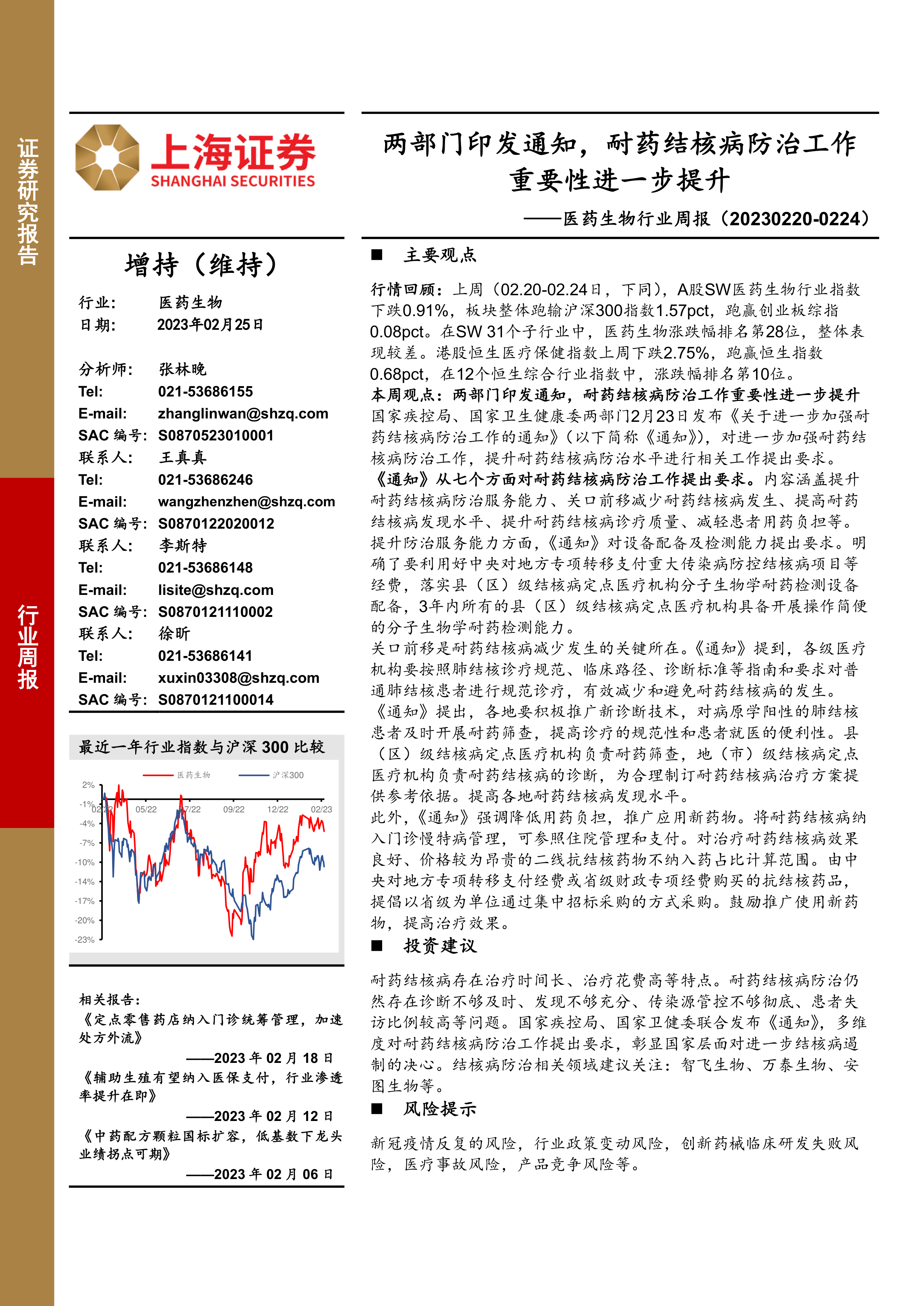 本报告分析了上周医药生物板块的市场表现,重点关注了国家发布的关于加强耐药结核病防治工作的通知,并对该通知对医药行业的影响进行了分析。 报告指出,国家对耐药结核病防治工作的重视程度进一步提升,这将对相关医药企业带来积极影响。 同时,报告也简要回顾了上周医药生物板块的市场表现以及国内外医药行业的最新动态,并提出了相应的投资建议。 投资者应结合自身情况,谨慎决策。 需要注意的是,报告中提到的投资建议仅供参考,不构成投资建议。 市场存在风险,投资需谨慎。