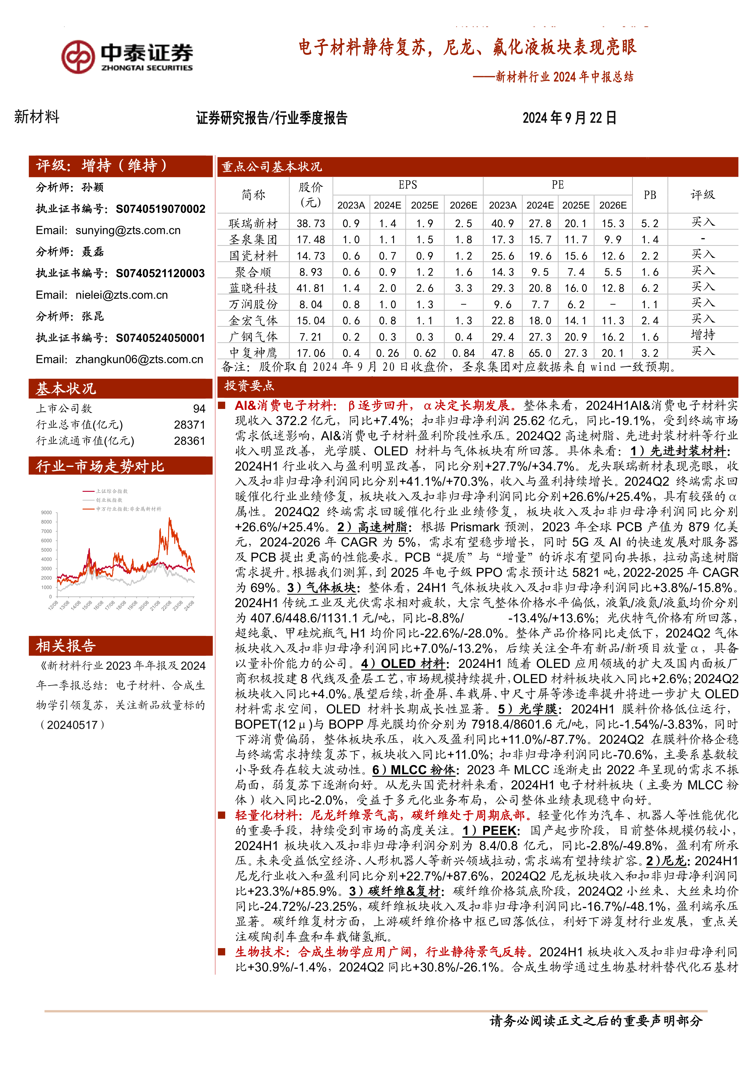 新材料行业2024年中报总结:电子材料静待复苏,尼龙、氟化液板块表现亮眼