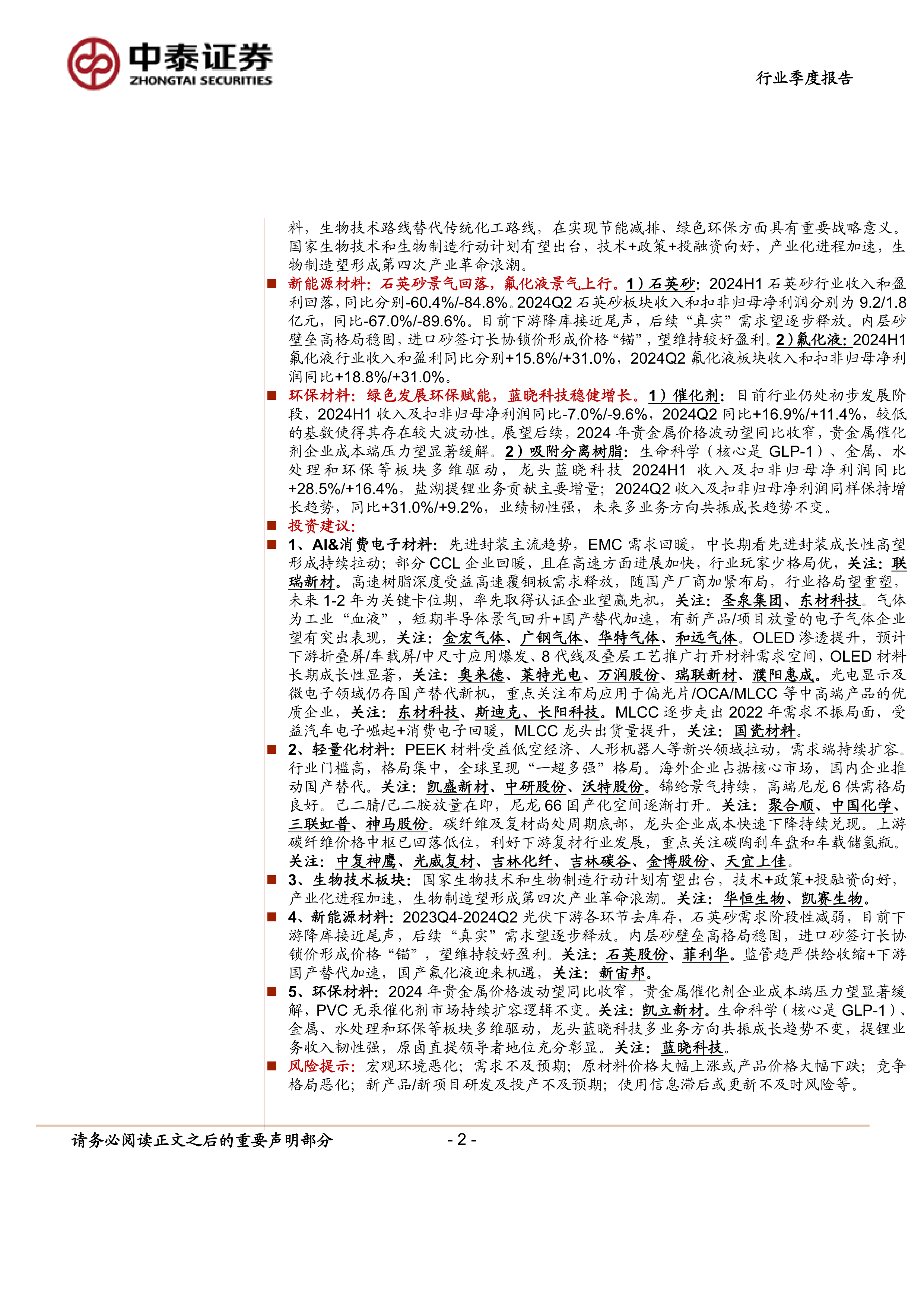 本报告总结了2024年新材料行业中报数据,核心观点如下:
