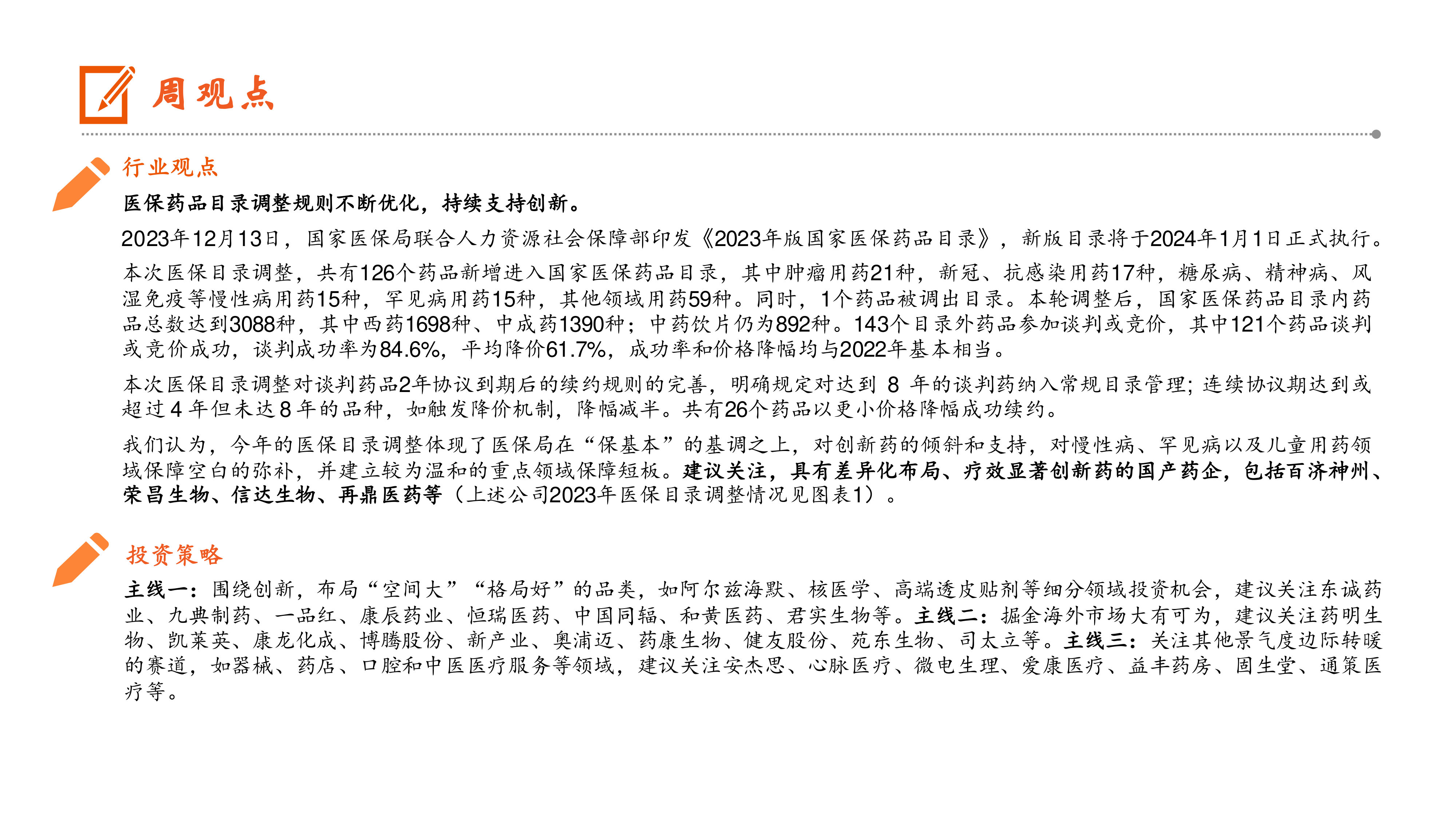 本报告的核心观点是:2023年版国家医保药品目录调整体现了医保局在“保基本”的基调下,对创新药的倾斜和支持,并对慢性病、罕见病及儿童用药领域进行了补充。 报告建议关注以下几类投资机会: