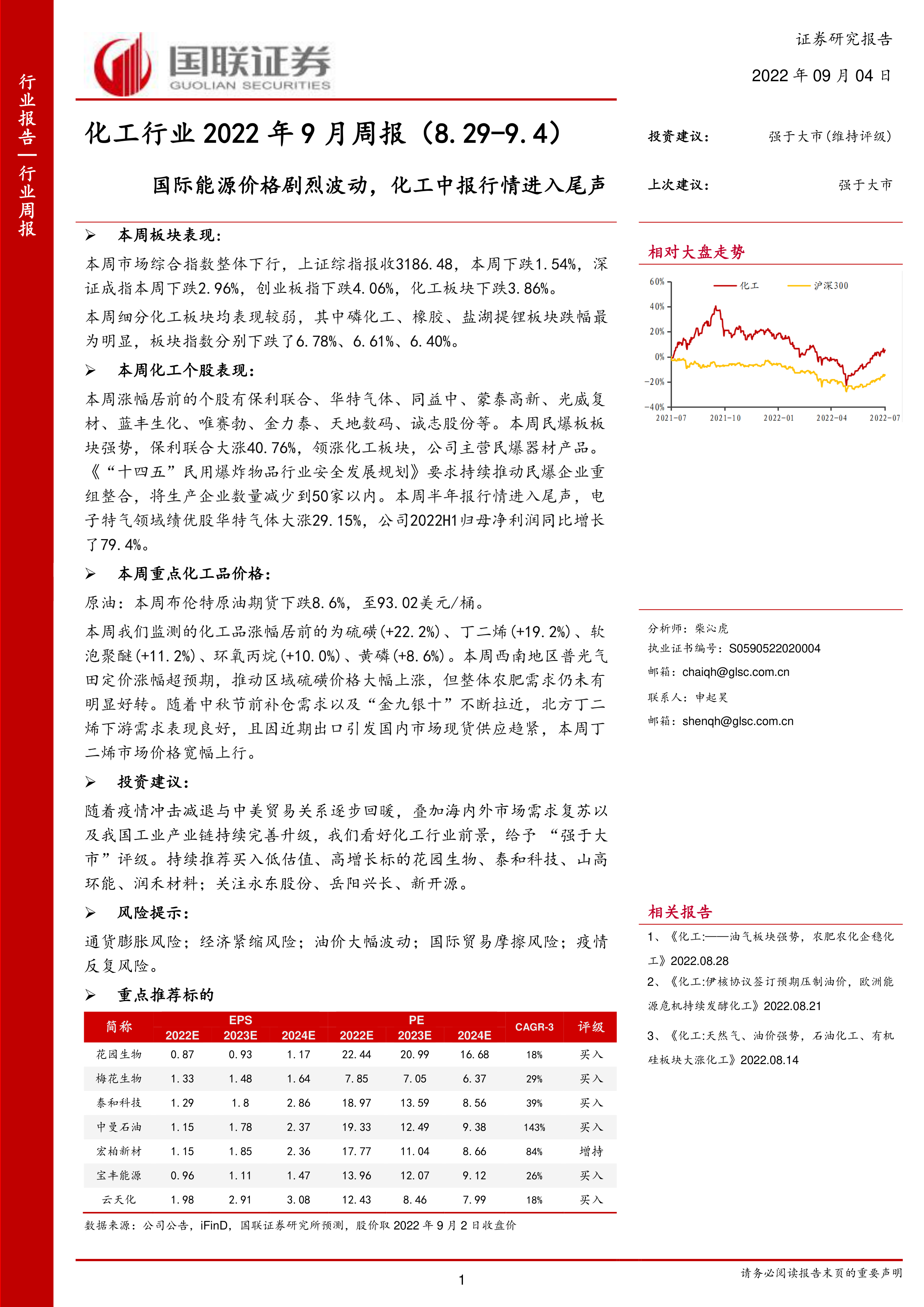 化工行业2022年9月周报:国际能源价格剧烈波动,化工中报行情进入尾声