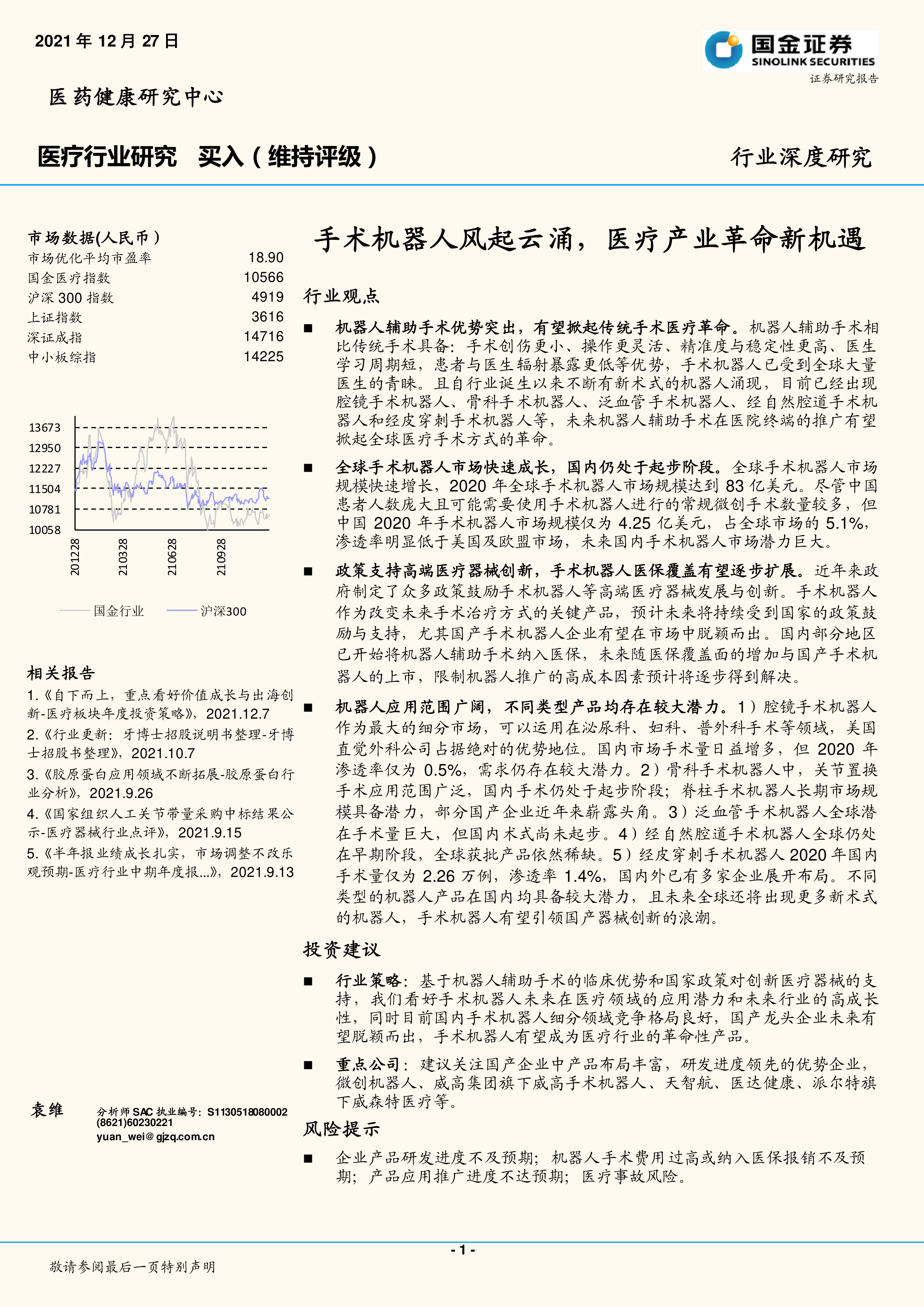 行业策略:基于机器人辅助手术的临床优势和国家政策对创新医疗器械的支持,我们看好手术机器人未来在医疗领域的应用潜力和未来行业的高成长性,同时目前国内手术机器人细分领域竞争格局良好,国产龙头企业未来有望脱颖而出,手术机器人有望成为医疗行业的革命性产品。