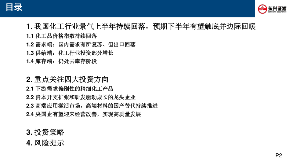 报告总结了投资策略,建议重点关注上述四大投资方向,并提示了化工品需求大幅下滑、成本端原料价格大幅波动以及行业新增产能投放超预期等风险。