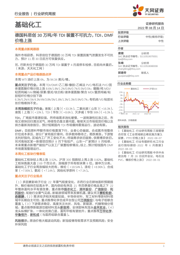 基础化工行业研究周报:德国科思创30万吨/年TDI装置不可抗力,TDI、DMF价格上涨