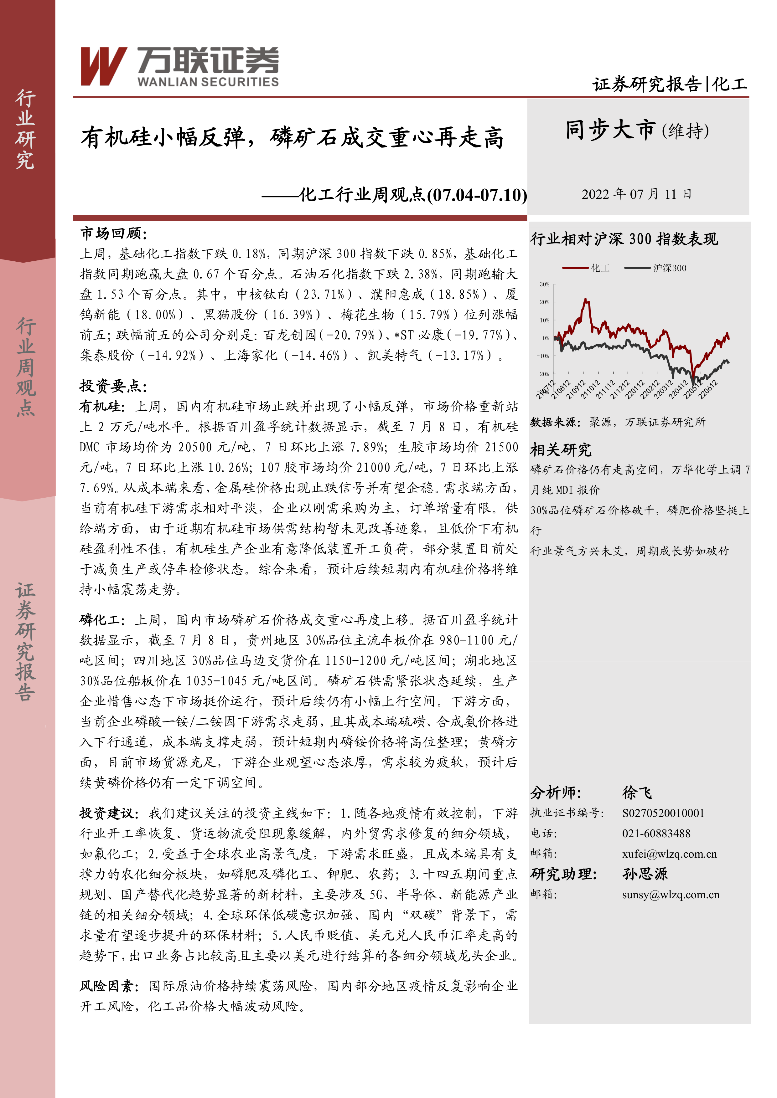 化工行业周观点:有机硅小幅反弹,磷矿石成交重心再走高