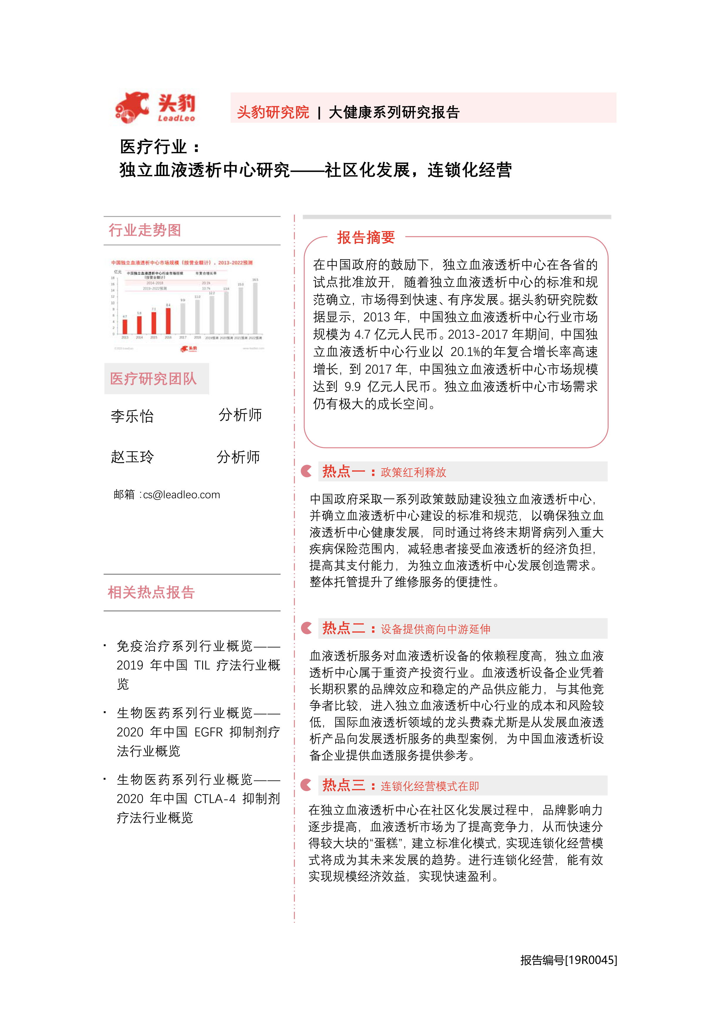 医疗行业:独立血液透析中心研究——社区化发展,连锁化经营
