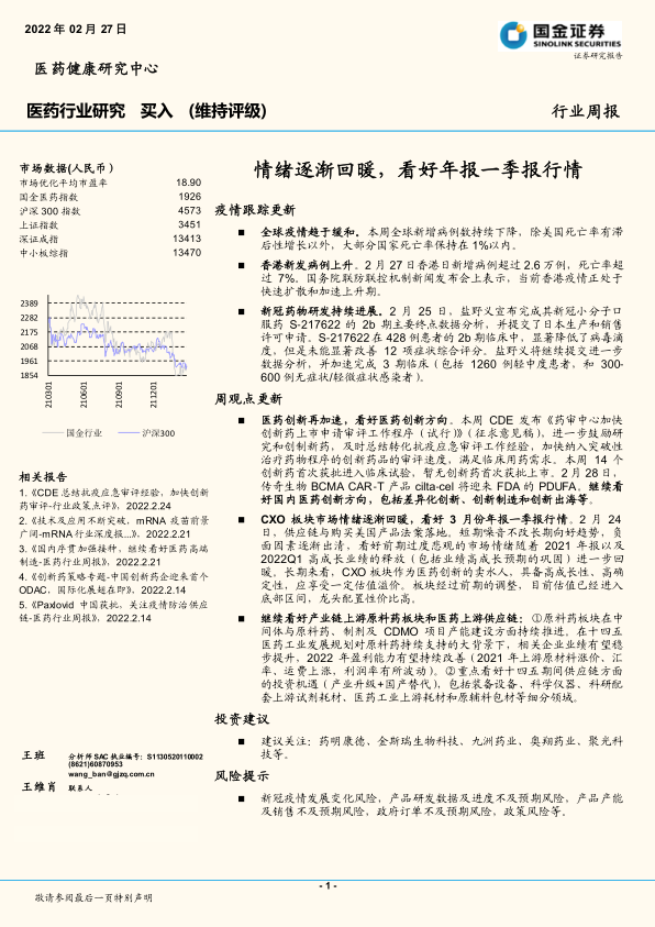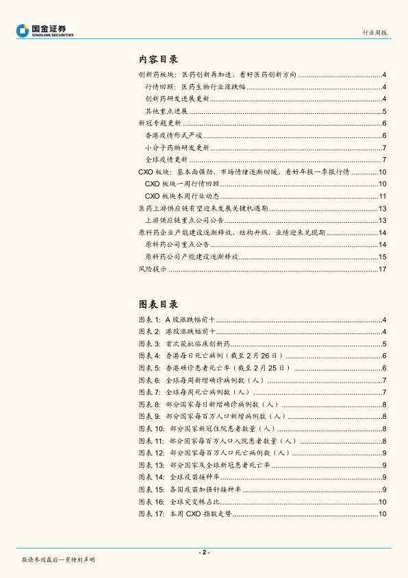 本报告的核心观点是:医药行业在经历前期调整后,市场情绪逐渐回暖,看好年报一季报行情。创新药板块持续加速,CXO板块估值进入底部区间,医药上游供应链有望迎来发展机遇期。 具体而言,报告从创新药研发进展、新冠疫情全球及香港地区动态、CXO板块行情及公司业绩、医药上游供应链发展机遇等方面,利用数据和统计分析,对医药行业未来发展趋势进行预测和分析,并给出相应的投资建议。