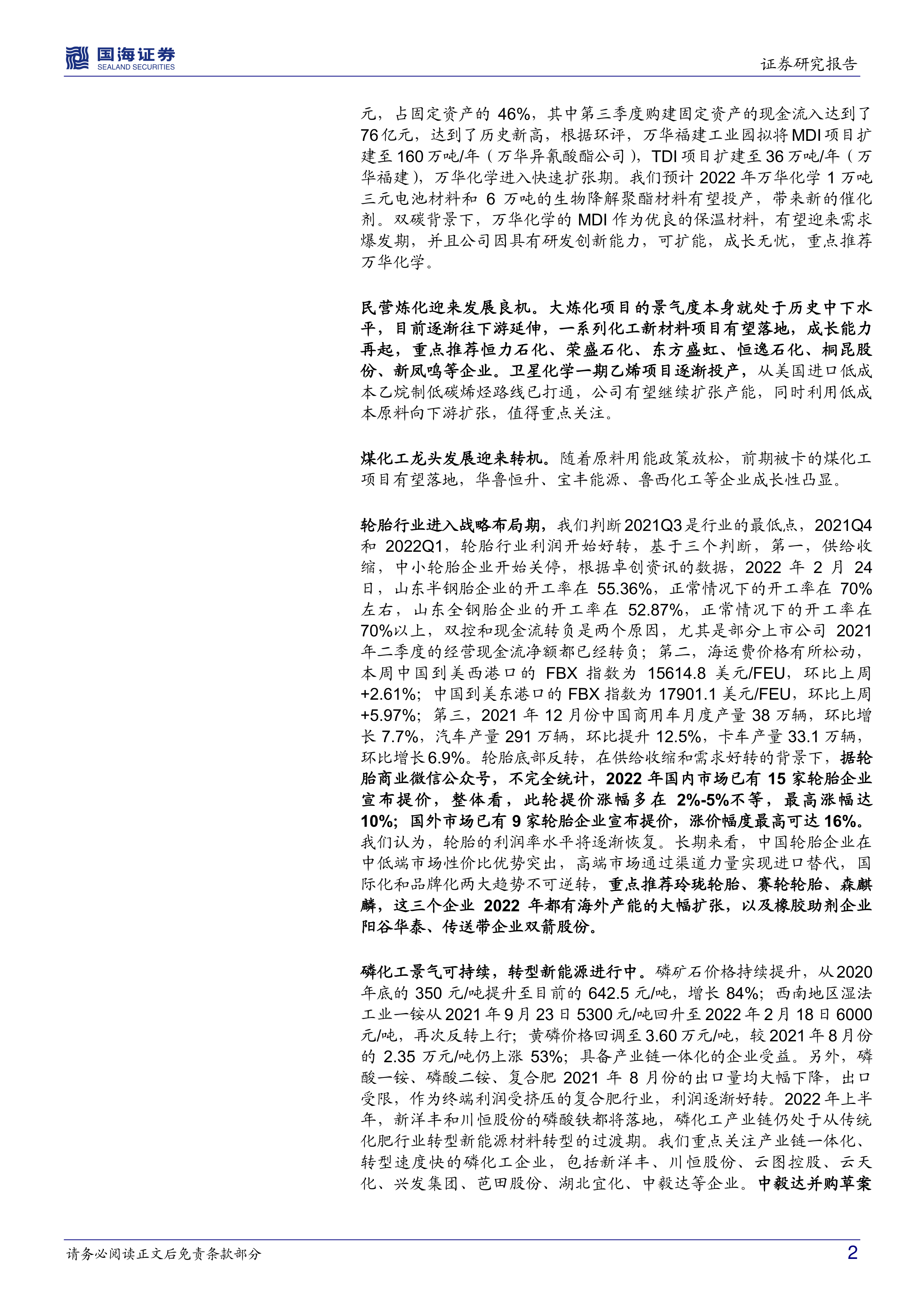 煤化工龙头发展迎来转机。随着原料用能政策放松,前期被卡的煤化工项目有望落地,华鲁恒升、宝丰能源、鲁西化工等企业成长性凸显。轮胎行业进入战略布局期,我们判断 2021Q3 是行业的最低点,2021Q4和 2022Q1,轮胎行业利润开始好转,基于三个判断,第一,供给收缩,中小轮胎企业开始关停,根据卓创资讯的数据,2022 年 2 月 24日,山东半钢胎企业的开工率在 55.36%,正常情况下的开工率在 70%左右,山东全钢胎企业的开工率在 52.87%,正常情况下的开工率在70%以上,双控和现金流转负是两个原因,尤其是部分上市公司 2021年二季度的经营现金流净额都已经转负;第二,海运费价格有所松动,本周中国到美西港口的 FBX 指数为 15614.8 美元/FEU,环比上周+2.61%;中国到美东港口的 FBX 指数为 17901.1 美元/FEU,环比上周+5.97%;第三,2021 年 12 月份中国商用车月度产量 38 万辆,环比增长 7.7%,汽车产量 291 万辆,环比提升 12.5%,卡车产量 33.1 万辆,环比增长 6.9%。轮胎底部反转,在供给收缩和需求好转的背景下,据轮胎商业微信公众号,不完全统计,2022 年国内市场已有 15 家轮胎企业宣布提价,整体看,此轮提价涨幅多在 2%-5%不等,最高涨幅达10%;国外市场已有 9 家轮胎企业宣布提价,涨价幅度最高可达 16%。我们认为,轮胎的利润率水平将逐渐恢复。长期来看,中国轮胎企业在中低端市场性价比优势突出,高端市场通过渠道力量实现进口替代,国际化和品牌化两大趋势不可逆转,重点推荐玲珑轮胎、赛轮轮胎、森麒麟,这三个企业 2022 年都有海外产能的大幅扩张,以及橡胶助剂企业阳谷华泰、传送带企业双箭股份。