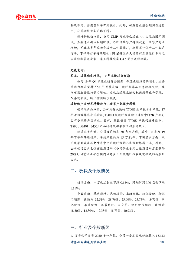 本部分简要总结了申万化工指数及部分个股的涨跌幅情况,并列举了涨幅居前和跌幅居前的个股。