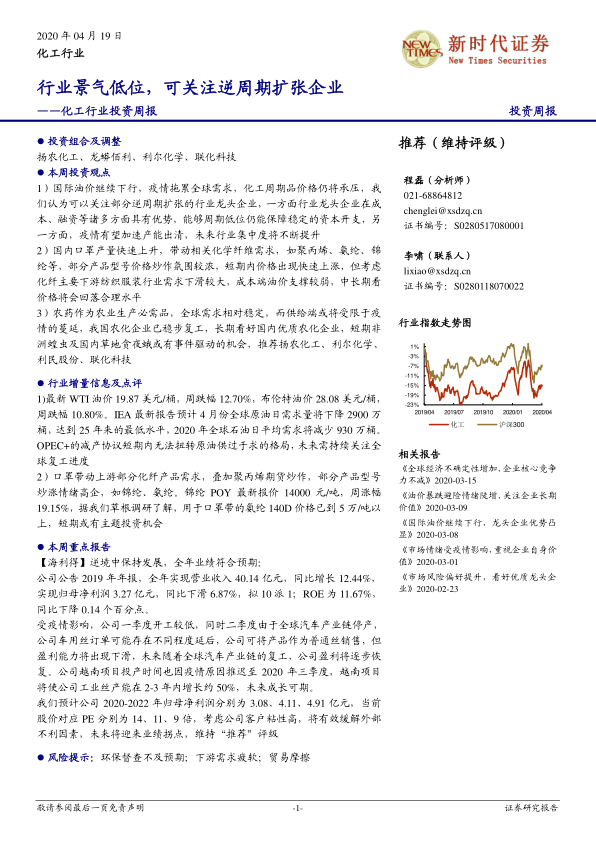 报告指出国际油价持续下跌,全球需求疲软,化工周期品价格承压。建议关注逆周期扩张的行业龙头企业,因为它们在成本、融资等方面具有优势,能够在周期低位保障稳定的资本开支,并受益于疫情加速的产能出清和未来行业集中度提升。报告还分析了口罩需求对部分化纤产品(聚丙烯、氨纶、锦纶等)价格的短期影响,以及农药行业在全球需求相对稳定和供给端受限情况下的长期发展前景。