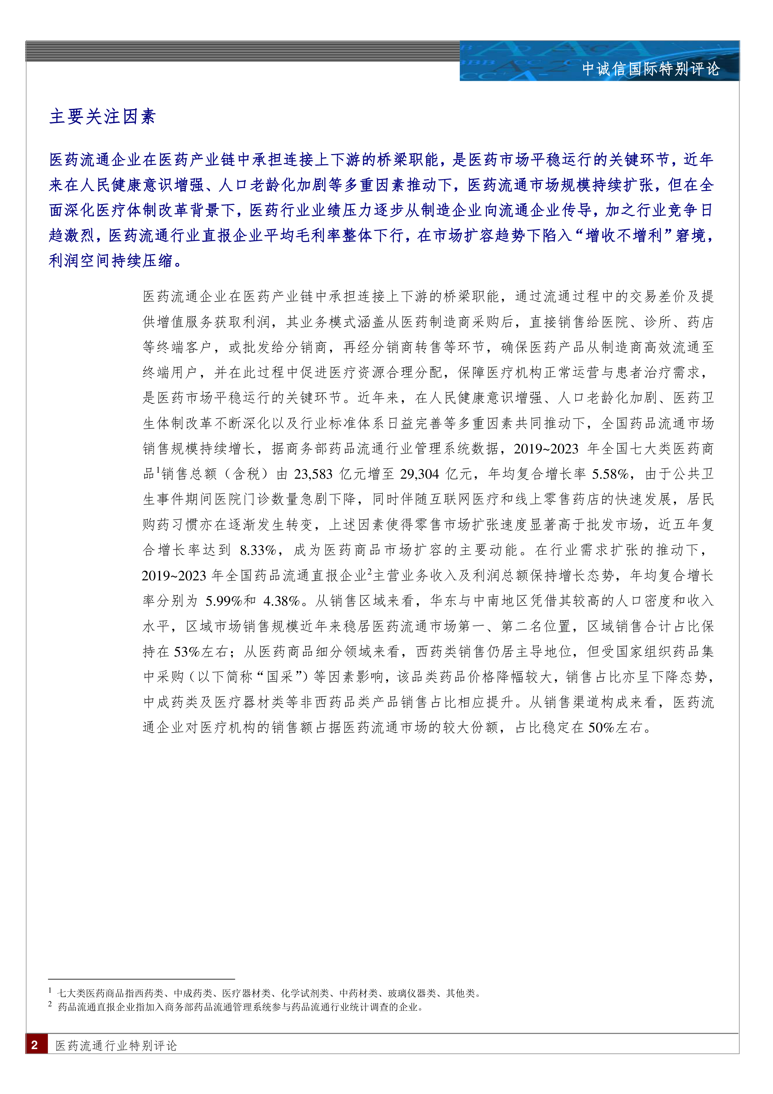 本报告基于中诚信国际对医药流通行业的特别评论,利用统计数据和市场分析,得出以下核心观点: