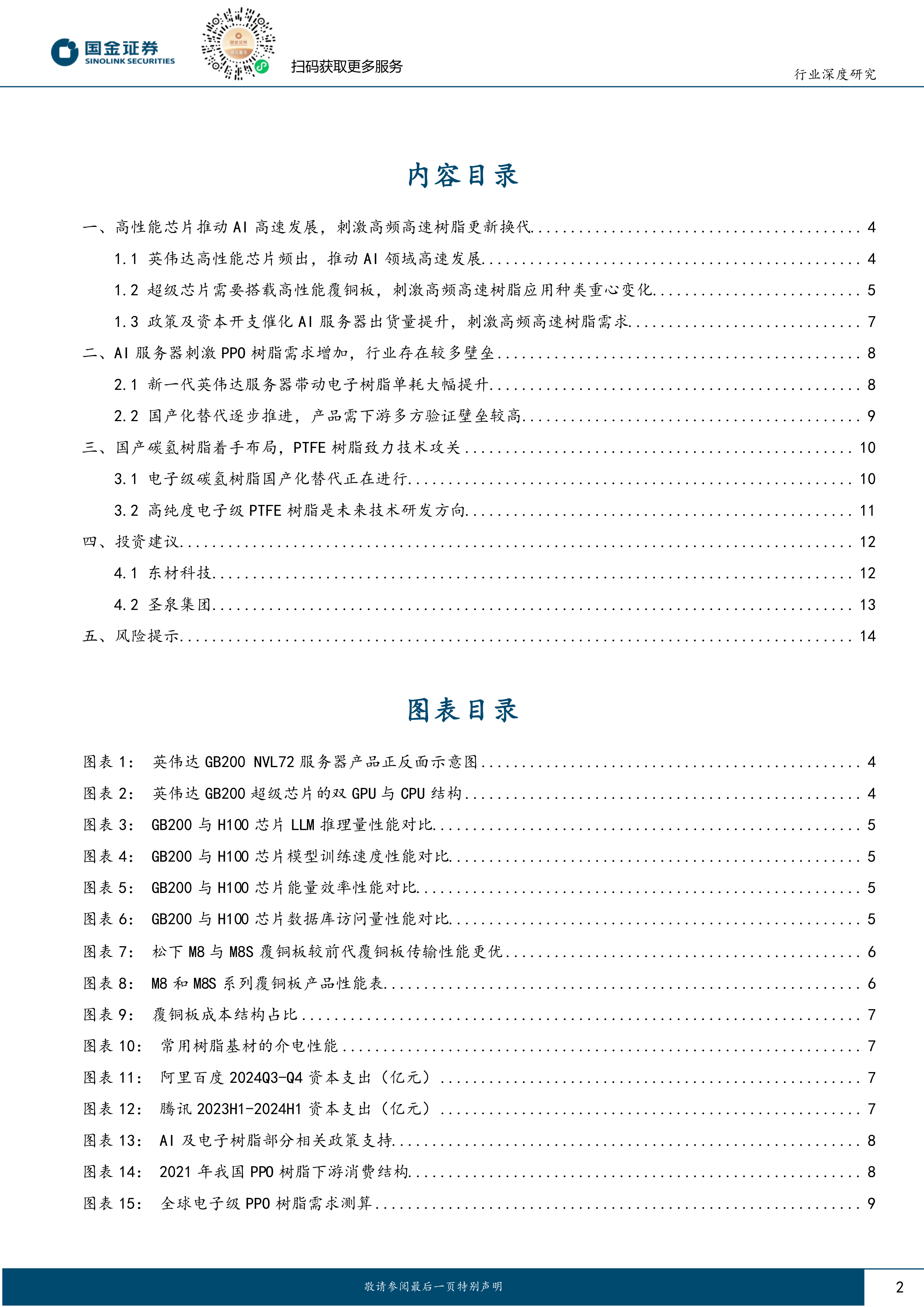 本报告基于英伟达高性能芯片推动AI高速发展的趋势,分析了高频高速树脂材料市场需求的增长潜力,并对PPO、碳氢树脂和PTFE等电子级树脂材料的市场前景进行了预测。 报告同时指出了高频高速树脂材料国产化替代进程中面临的技术壁垒和市场挑战,并提出了相应的投资建议和风险提示。 总体而言,高性能芯片的持续发展将驱动AI服务器市场的高速增长,进而带动高频高速树脂材料的需求,为相关企业带来发展机遇,但也存在一定的市场风险。