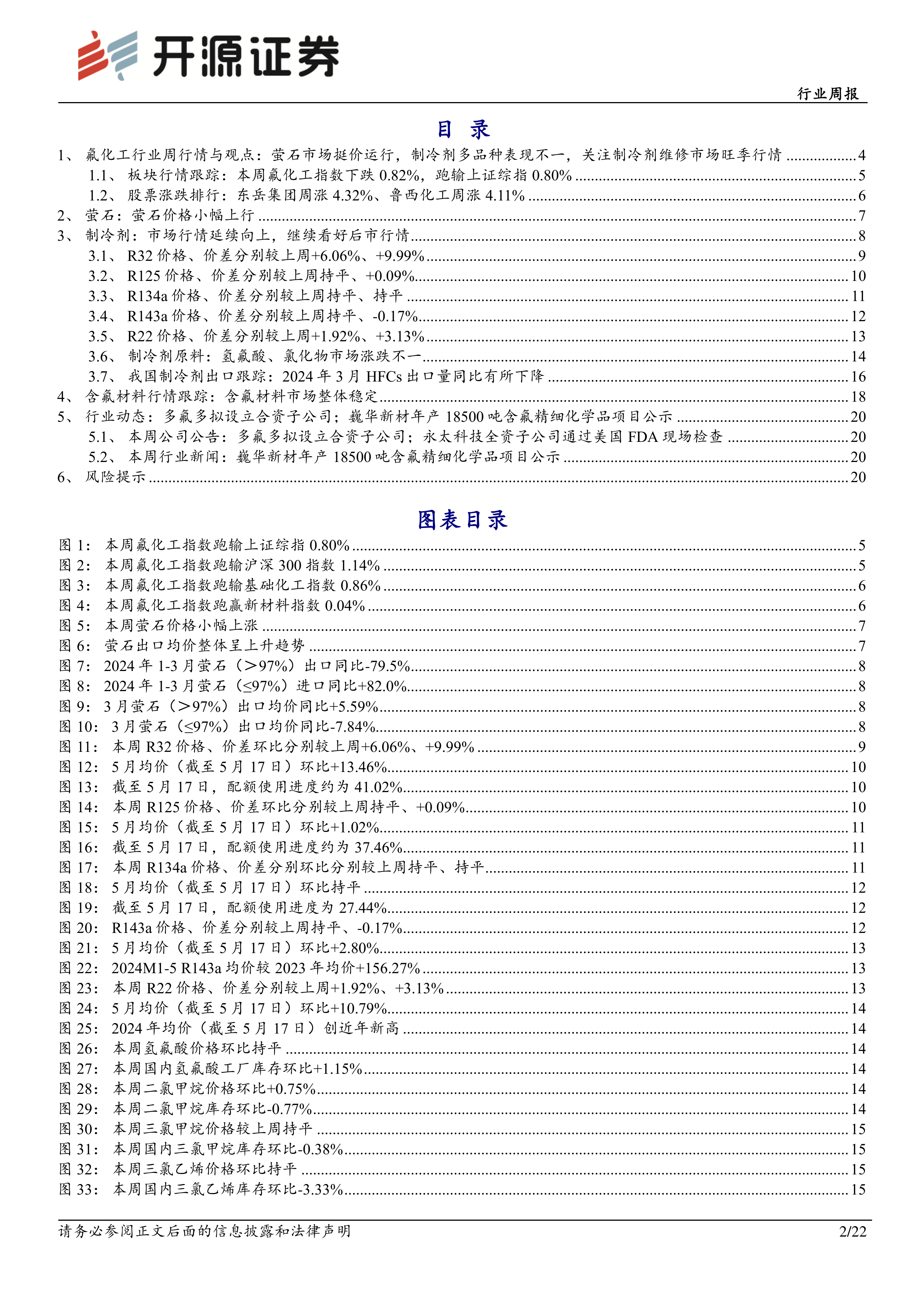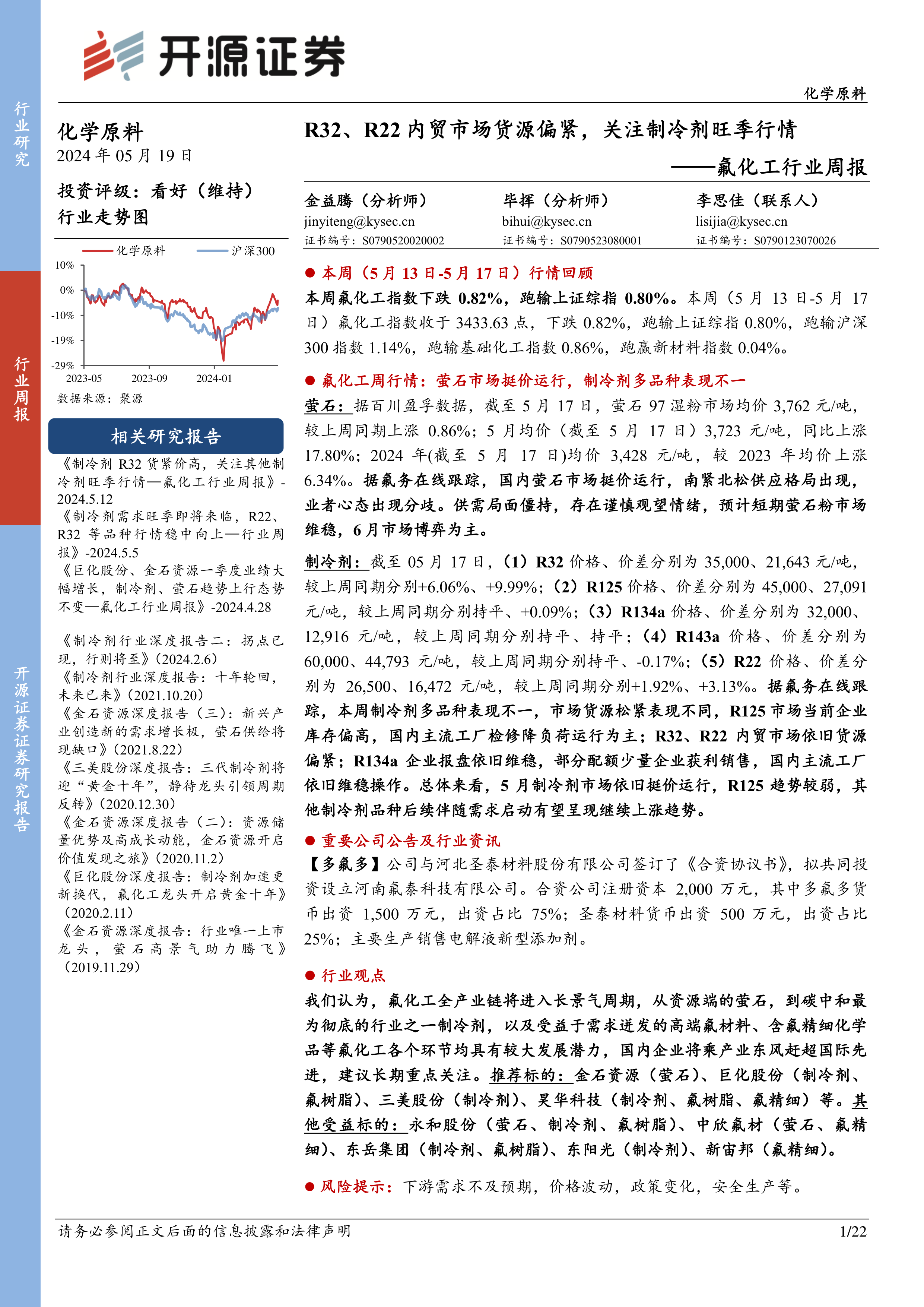 氟化工行业周报:R32、R22内贸市场货源偏紧,关注制冷剂旺季行情