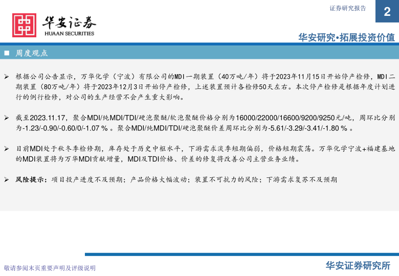 目前MDI处于秋冬季检修期,库存处于历史中枢水平,下游需求淡季短期偏弱,价格短期震荡。万华化学宁波+福建基地的MDI装置将为万华MDI贡献增量,MDI及TDI价格、价差的修复将改善公司主营业务业绩。
