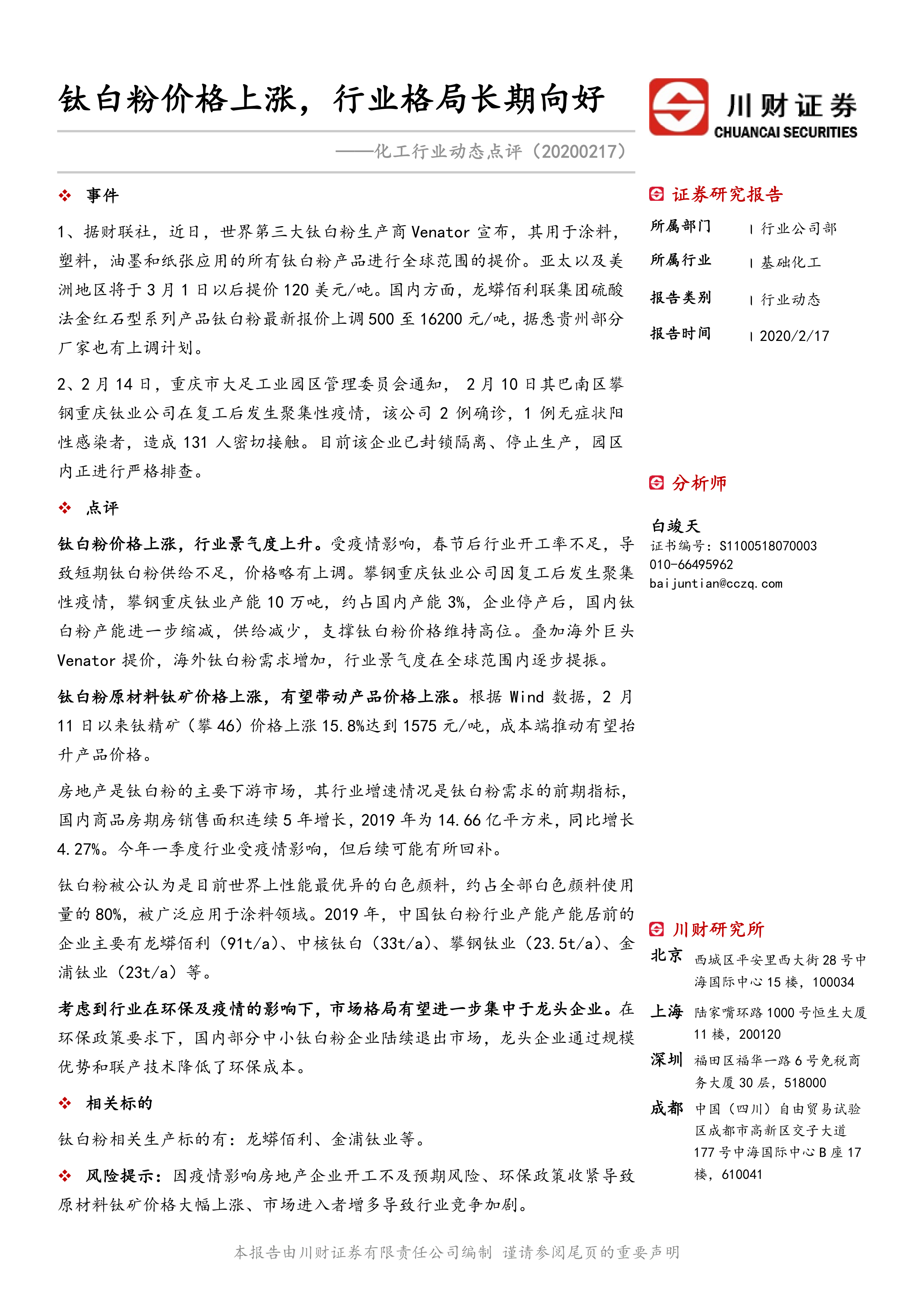化工行业动态点评:钛白粉价格上涨,行业格局长期向好